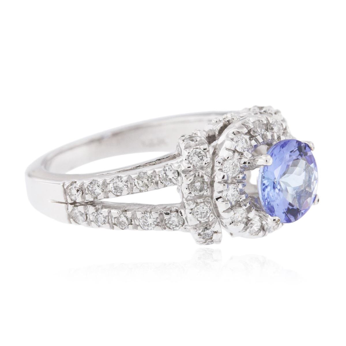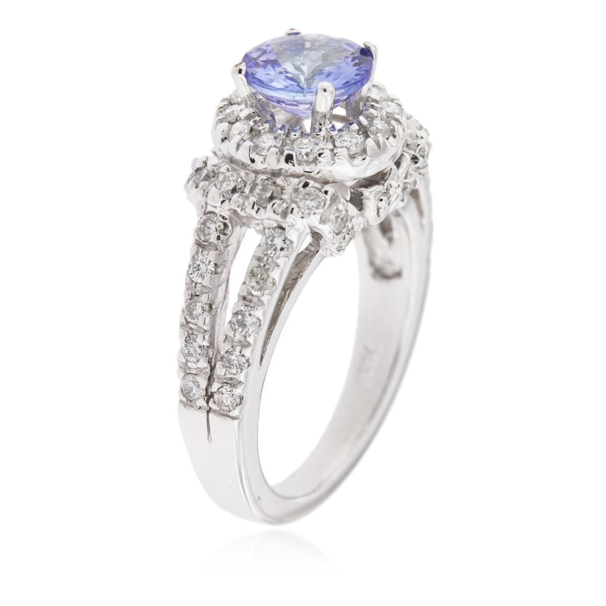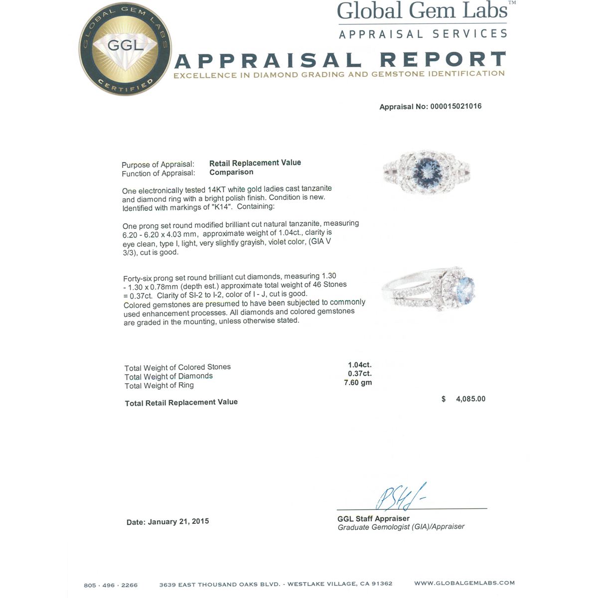 One electronically tested 14KT white gold ladies cast tanzanite and diamond ring with a bright polish finish. Identified with markings of "K14". Condition is new. Containing: One prong set round modified brilliant cut natural tanzanite, measuring 6.20 - 6.20 x 4.03 mm, approximate weight of 1.04ct., clarity is eye clean, type I, light, very slightly grayish, violet color, (GIA V 3/3), cut is good. Forty-Six prong set round brilliant cut diamonds, measuring 1.30 - 1.30 x 0.78mm (depth est.) approximate total weight of 46 Stones = 0.37ct. Clarity: SI-2 to I-2. Color: I - J, Cut is Good. Colored gemstones are presumed to have been subjected to commonly used enhancement processes. All diamonds and colored gemstones are graded in the mounting, unless otherwise stated. Total Weight of Colored Stones 1.04ct. Total Weight of Diamonds 0.37ct. Total Weight of Ring 7.60 grams. GGL Appraised at $4,085.00.