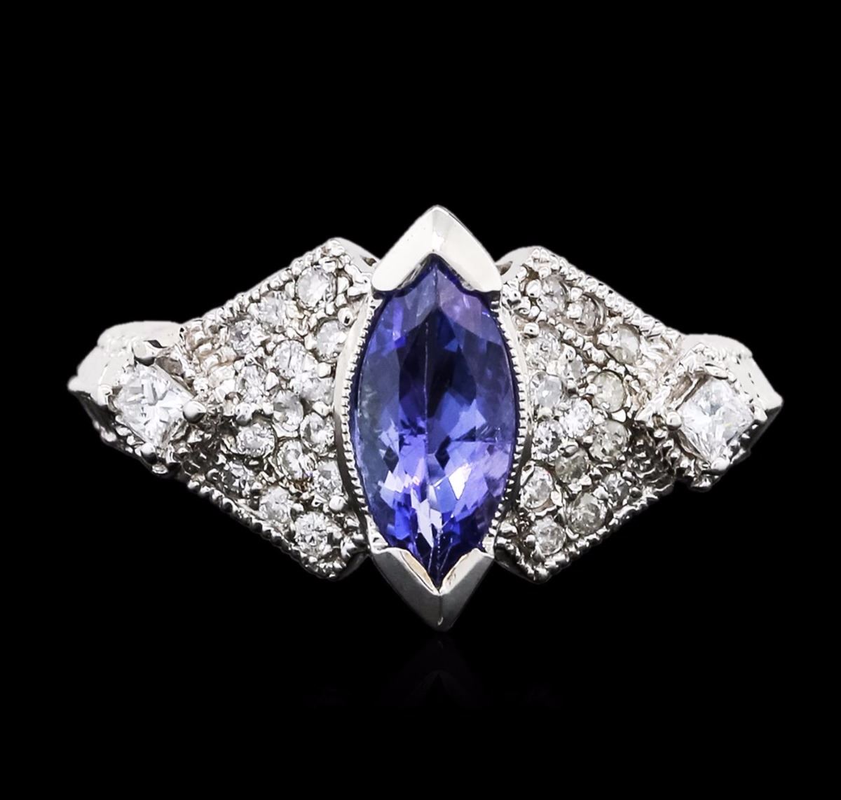 One ring featuring: 14KT white gold weighing 5.87 grams containing one tanzanite center stone with a total weight of 1.04ct and round diamonds with a total weight of 0.34cts.