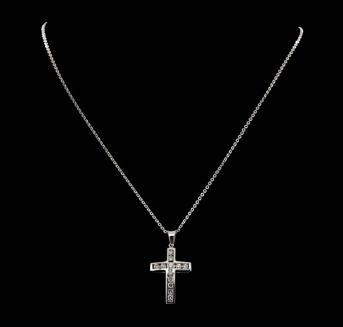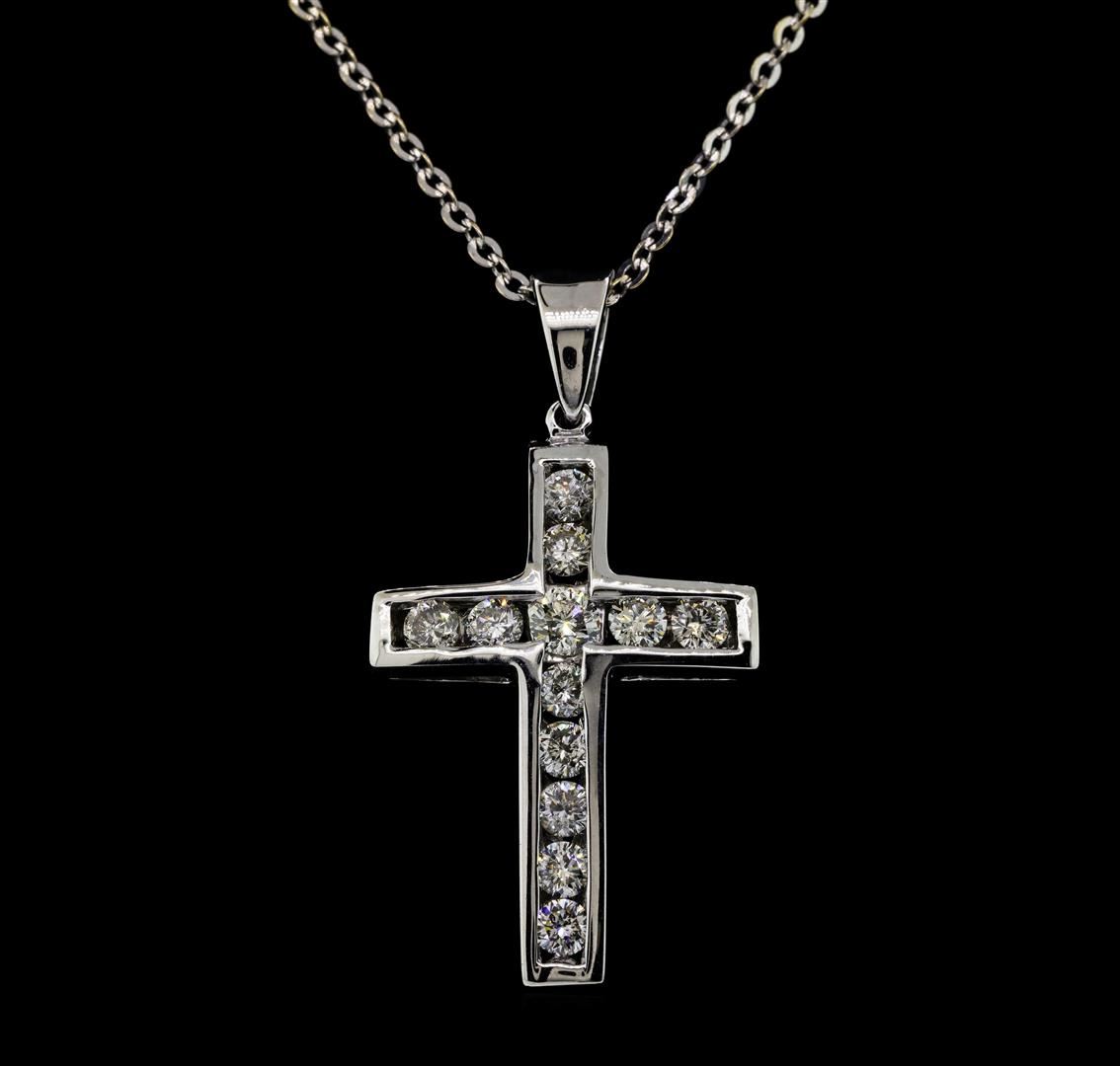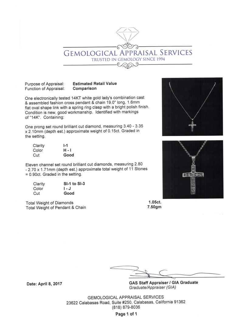 One electronically tested 14KT white gold lady's combination cast & assembled fashion cross pendant & chain 19.0" long, 1.6mm flat oval shape link with a spring ring clasp with a bright polish finish. Identified with markings of "14K". Condition is new, good workmanship. Containing: One prong set round brilliant cut diamond, measuring 3.40 - 3.35 x 2.10mm (depth est.) approximate weight of 0.15ct. Graded in the setting. Color H - I Clarity I-1 Cut Good Eleven channel set round brilliant cut diamonds, measuring 2.80 - 2.70 x 1.71mm (depth est.) approximate total weight of 11 Stones = 0.90ct. Graded in the setting. Color I - JClarity SI-1 to SI-3 Cut Good. Total Weight of Diamonds 1.05ct. Total Weight of Pendant & Chain 7.50gm. GAS Appraised.
