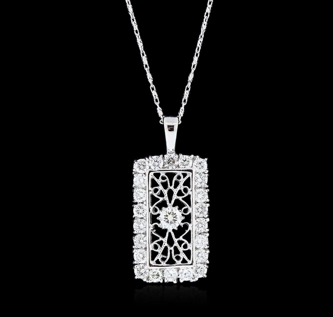 One electronically tested 14KT white gold ladies cast diamond pendant & chain 18.0" long, cable link with a lobster claw clasp with a bright polish finish. Identified with markings of "14K". Condition is new. Containing: One prong set round brilliant cut diamond, measuring 3.60 - 3.90 x 2.25mm (depth est.) approximate weight of 0.19ct. Clarity: I-1. Color: J, Cut is Good. Twenty-Two prong set round brilliant cut diamonds, measuring 2.20 - 2.20 x 1.32mm (depth est.) approximate total weight of 22 Stones = 0.86ct. Clarity: SI-1 to SI-2. Color: I - J, Cut is Good. All diamonds are graded in the mounting, unless otherwise stated. Total Weight of Diamonds 1.05ct. Total Weight of Pendant & Chain 5.90 grams. GGL Appraised at $4,930.00.