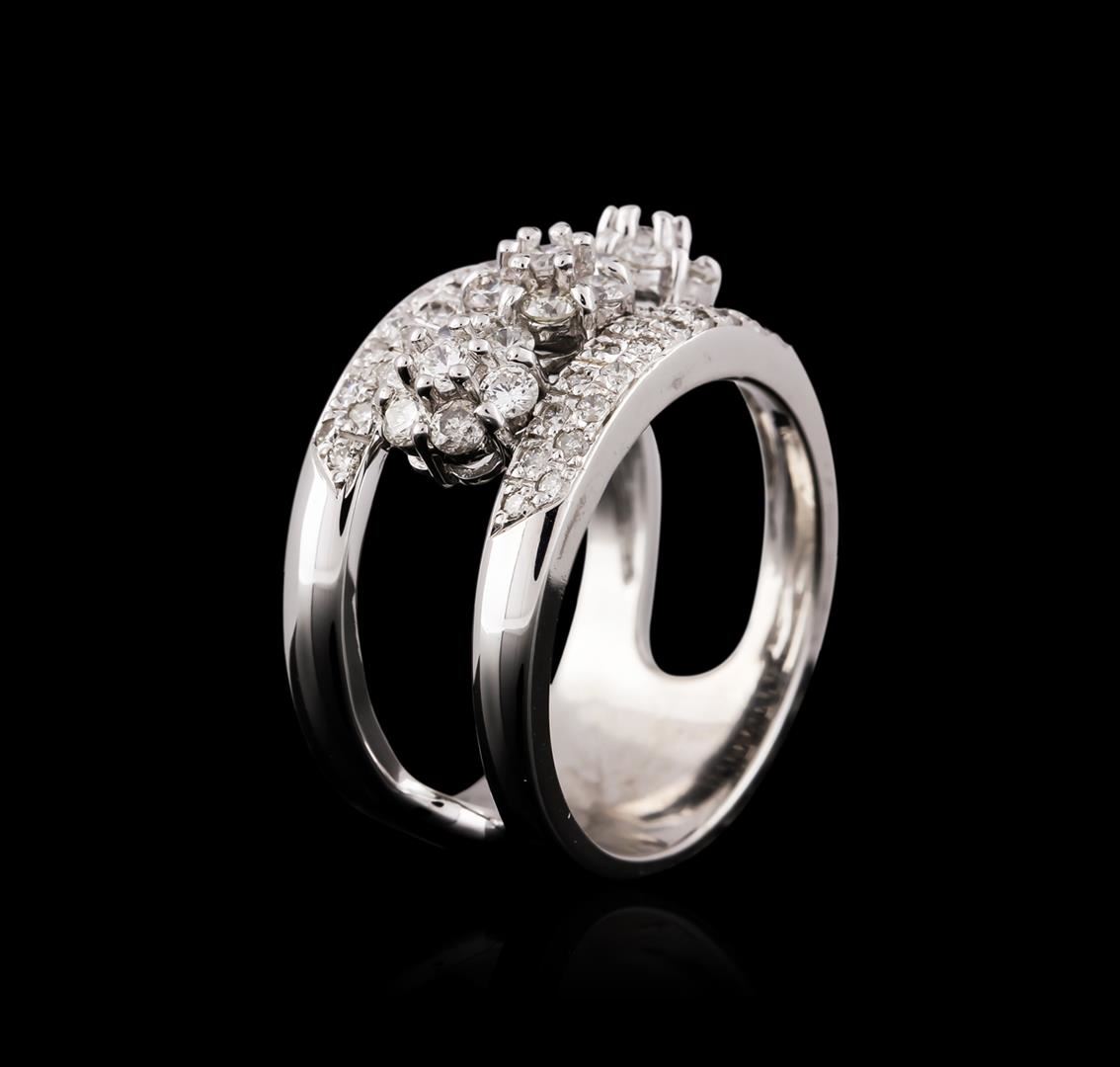 One electronically tested 14KT white gold ladies cast diamond ring with a bright polish finish. Identified with markings of "14K". Condition is very good. Containing: Twenty-One prong set round brilliant cut diamonds, measuring 2.10 - 2.10 x 1.26mm (depth est.) approximate total weight of 21 Stones = 0.71ct. Clarity: SI-1 to SI-2. Color: H - I, Cut is Good. Forty-Two prong set round brilliant cut diamonds, measuring 1.30 - 1.30 x 0.78mm (depth est.) approximate total weight of 42 Stones = 0.34ct. Clarity: SI-1 to I-1. Color: H - I. All diamonds are graded in the mounting, unless otherwise stated. Total Weight of Diamonds 1.05ct. Total Weight of Ring 9.10 grams. GGL Appraised at $5,485.00.