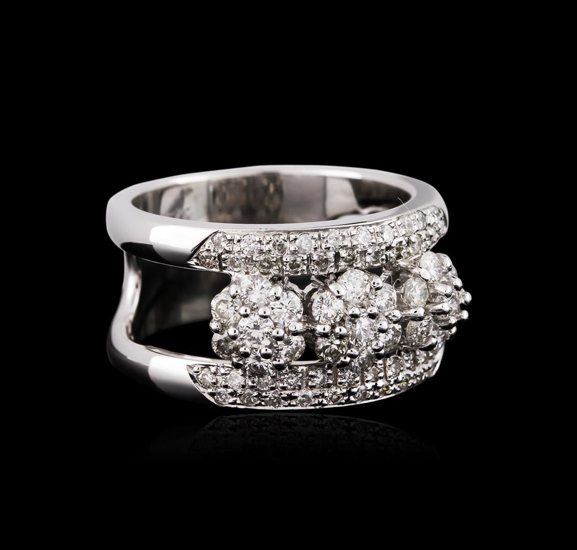 One electronically tested 14KT white gold ladies cast diamond ring with a bright polish finish. Identified with markings of "14K". Condition is very good. Containing: Twenty-One prong set round brilliant cut diamonds, measuring 2.10 - 2.10 x 1.26mm (depth est.) approximate total weight of 21 Stones = 0.71ct. Clarity: SI-1 to SI-2. Color: H - I, Cut is Good. Forty-Two prong set round brilliant cut diamonds, measuring 1.30 - 1.30 x 0.78mm (depth est.) approximate total weight of 42 Stones = 0.34ct. Clarity: SI-1 to I-1. Color: H - I. All diamonds are graded in the mounting, unless otherwise stated. Total Weight of Diamonds 1.05ct. Total Weight of Ring 9.10 grams. GGL Appraised at $5,485.00.