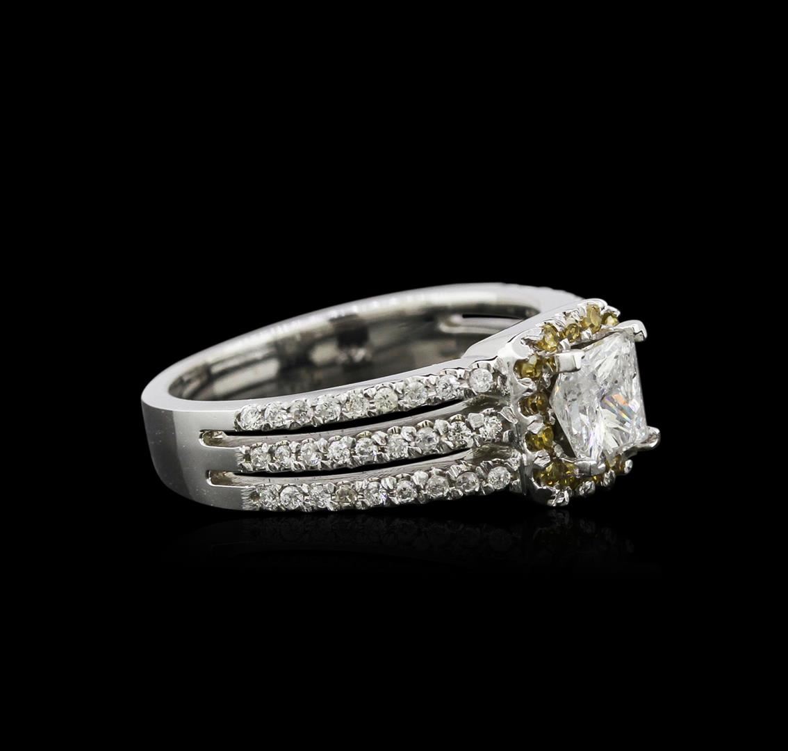 One electronically tested 14KT white gold ladies cast diamond ring with a bright polish finish. Identified with markings of "14K". Condition is new. Containing: One prong set princess cut diamond, measuring 4.90 x 4.80 x 3.60mm (depth est.) approximate weight of 0.70ct. Clarity: I-2. Color: H, Cut is Good. Thirty-Six prong set round brilliant cut diamonds, measuring 1.10 - 1.10 x 0.66mm (depth est.) approximate total weight of 36 Stones = 0.25ct. Clarity: I-1 to I-2. Color: H - I, Cut is Good. Fourteen single cut diamonds, measuring 1.10 - 1.10 x 0.66mm (depth est.) approximate total weight of 14 Stones = 0.10ct. Color of the stones has been treated. Diamonds are graded in the mounting, unless otherwise stated. Total Weight of Diamonds 1.05ct. Total Weight of Ring 5.50 grams. GGL Appraised at $3,625.00.