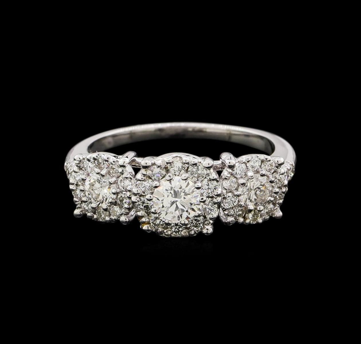 One electronically tested 14KT white gold ladies cast diamond engagement ring with a bright polish finish. Identified with markings of "K14". Condition is new. Containing: One prong set round brilliant cut diamond, measuring 4.50 - 4.50 x 2.70mm (depth est.) approximate weight of 0.33ct. Clarity: I-1. Color: J, Cut is Good. Two prong set round brilliant cut diamonds, measuring 3.50 - 3.50 x 2.10mm (depth est.) approximate total weight of 2 Stones = 0.31ct. Clarity: I-1. Color: J, Cut is Good. Thirty-Six prong set round brilliant cut diamonds, measuring 1.60 - 1.30 x 0.87mm (depth est.) approximate total weight of 36 Stones = 0.40ct. Clarity: SI-2 to I-1. Color: I - J, Cut is Good. All diamonds are graded in the mounting, unless otherwise stated. Total Weight of Diamonds 1.05ct. Total Weight of Engagement Ring 4.30 grams. GGL Appraised at $3,065.00.