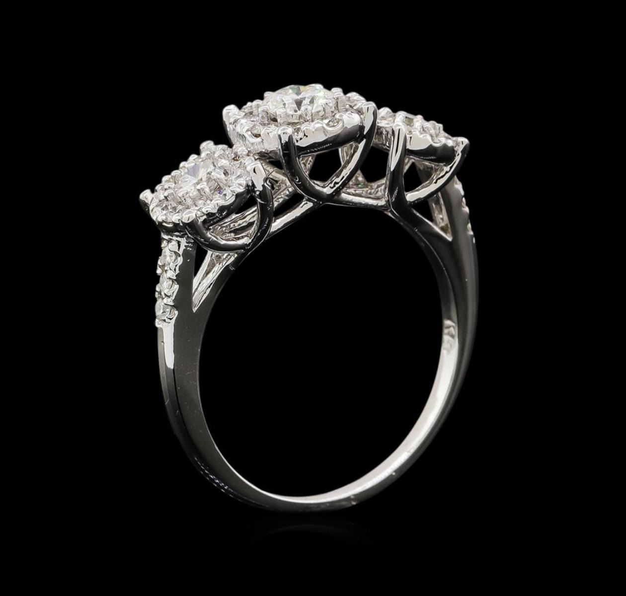 One electronically tested 14KT white gold ladies cast diamond engagement ring with a bright polish finish. Identified with markings of "K14". Condition is new. Containing: One prong set round brilliant cut diamond, measuring 4.50 - 4.50 x 2.70mm (depth est.) approximate weight of 0.33ct. Clarity: I-1. Color: J, Cut is Good. Two prong set round brilliant cut diamonds, measuring 3.50 - 3.50 x 2.10mm (depth est.) approximate total weight of 2 Stones = 0.31ct. Clarity: I-1. Color: J, Cut is Good. Thirty-Six prong set round brilliant cut diamonds, measuring 1.60 - 1.30 x 0.87mm (depth est.) approximate total weight of 36 Stones = 0.40ct. Clarity: SI-2 to I-1. Color: I - J, Cut is Good. All diamonds are graded in the mounting, unless otherwise stated. Total Weight of Diamonds 1.05ct. Total Weight of Engagement Ring 4.30 grams. GGL Appraised.