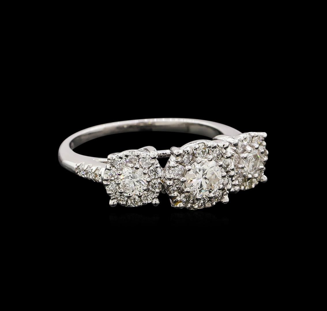 One electronically tested 14KT white gold ladies cast diamond engagement ring with a bright polish finish. Identified with markings of "K14". Condition is new. Containing: One prong set round brilliant cut diamond, measuring 4.50 - 4.50 x 2.70mm (depth est.) approximate weight of 0.33ct. Clarity: I-1. Color: J, Cut is Good. Two prong set round brilliant cut diamonds, measuring 3.50 - 3.50 x 2.10mm (depth est.) approximate total weight of 2 Stones = 0.31ct. Clarity: I-1. Color: J, Cut is Good. Thirty-Six prong set round brilliant cut diamonds, measuring 1.60 - 1.30 x 0.87mm (depth est.) approximate total weight of 36 Stones = 0.40 ct. Clarity: SI-2 to I-1. Color: I - J, Cut is Good. All diamonds are graded in the mounting, unless otherwise stated. Total Weight of Diamonds 1.05ct. Total Weight of Engagement Ring 4.30 grams. GGL Appraised.