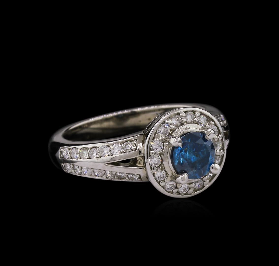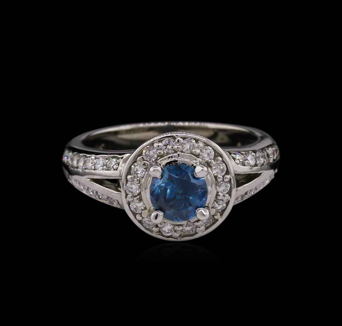 One electronically tested 14KT white gold ladies cast diamond engagement ring with a bright polish finish. Identified with markings of "K14". Condition is new. Containing: One prong set round brilliant cut diamond, measuring 5.80 - 5.80 x 3.48mm (depth est.) approximate weight of 0.71ct. Clarity: I-2, Cut is Good. The color of the stone has been treated. Forty-Two prong set round brilliant cut diamonds, measuring 1.30 - 1.30 x 0.78mm (depth est.) approximate total weight of 42 Stones = 0.34ct. Clarity: SI-1 to I-1. Color: I - J, Cut is Good. All diamonds are graded in the mounting, unless otherwise stated. Total Weight of Diamonds 1.05ct. Total Weight of Engagement Ring 6.00 grams. GGL Appraised at $4,440.00.