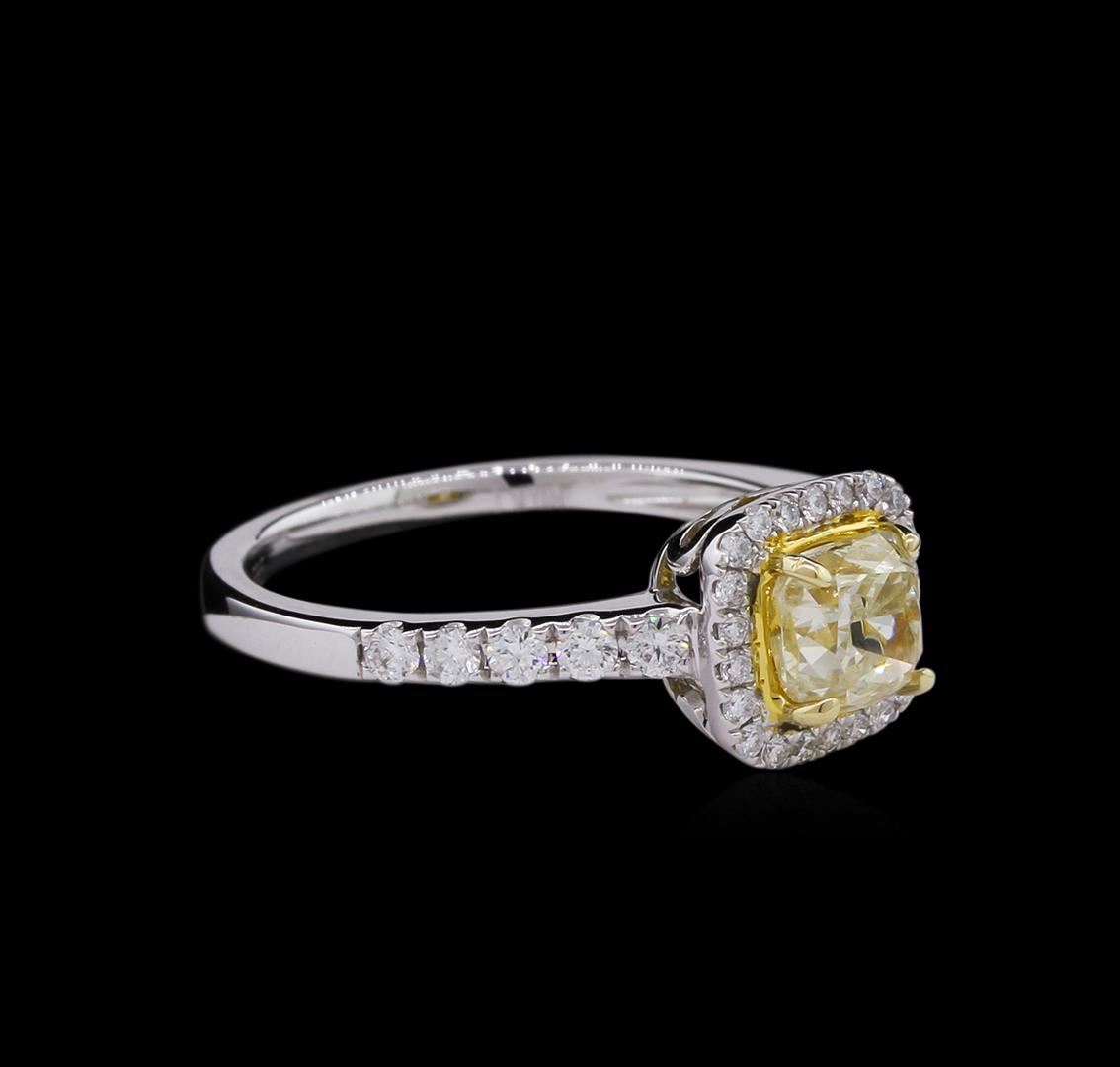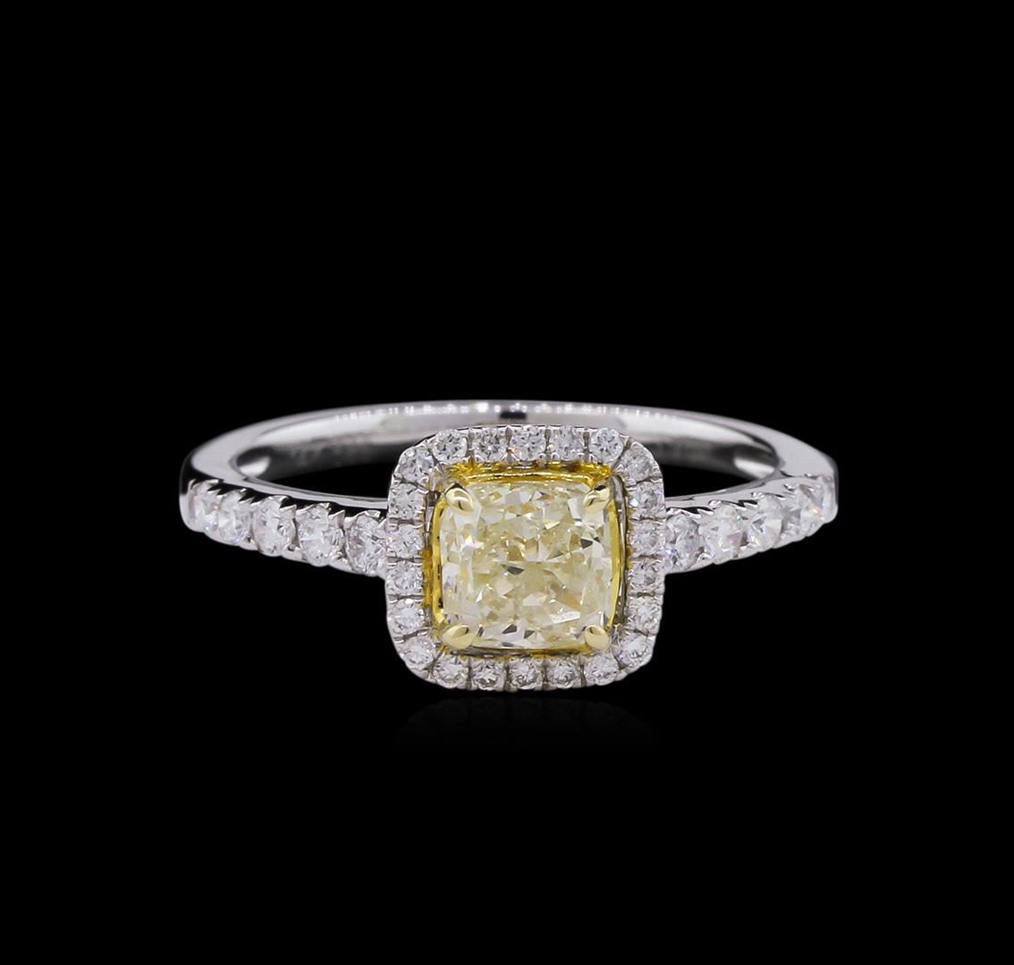 One electronically tested 14KT white gold ladies cast diamond unity ring. Condition is new, good workmanship. The featured diamond is set within a diamond bezel supported by diamond set shoulders, completed by a two millimeter wide band. Bright polish finish with yellow gold accents. Trademark is DAYANII. Identified with markings of "14K 585". Containing: One prong set cushion cut diamond, measuring 5.10 x 5.05 x 3.92mm (depth est.), 3.00% GTCF approximate weight of 1.05ct with a faint fluorescence. Graded in the setting. Clarity SI-1 Depth 77.6%Table 73.3% Ten prong set round brilliant cut diamonds, measuring 1.80 - 1.70 x 1.05mm (depth est.) approximate total weight of 10 Stones = 0.29ct. Graded in the setting. Clarity SI-1 to SI-2 Color G - I Twenty-Two prong set round brilliant cut diamonds, measuring 1.10 - 1.00 x 0.63mm (depth est.) approximate total weight of 22 Stones = 0.19ct. Graded in the setting. Clarity SI-1 to SI-2 Color G - I Total Weight of Diamonds 1.53ct. Total Weight of Ring 2.90 grams. AIG Appraised at $9,875.00.