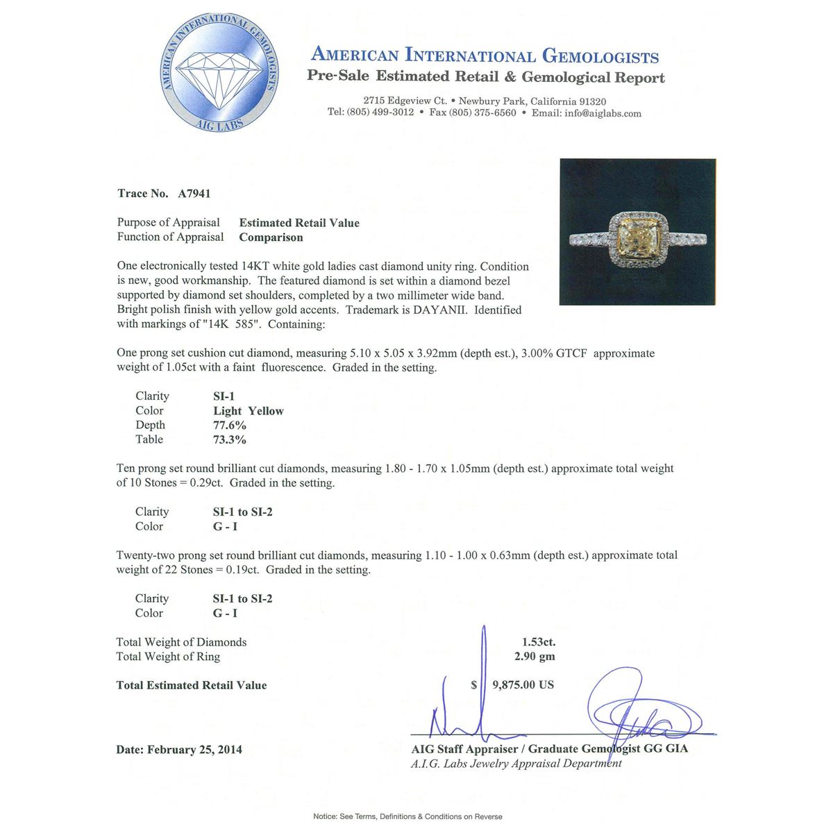 One electronically tested 14KT white gold ladies cast diamond unity ring. Condition is new, good workmanship. The featured diamond is set within a diamond bezel supported by diamond set shoulders, completed by a two millimeter wide band. Bright polish finish with yellow gold accents. Trademark is DAYANII. Identified with markings of "14K 585". Containing: One prong set cushion cut diamond, measuring 5.10 x 5.05 x 3.92mm (depth est.), 3.00% GTCF approximate weight of 1.05ct with a faint fluorescence. Graded in the setting. Clarity SI-1 Depth 77.6%Table 73.3% Ten prong set round brilliant cut diamonds, measuring 1.80 - 1.70 x 1.05mm (depth est.) approximate total weight of 10 Stones = 0.29ct. Graded in the setting. Clarity SI-1 to SI-2 Color G - I Twenty-Two prong set round brilliant cut diamonds, measuring 1.10 - 1.00 x 0.63mm (depth est.) approximate total weight of 22 Stones = 0.19ct. Graded in the setting. Clarity SI-1 to SI-2 Color G - I Total Weight of Diamonds 1.53ct. Total Weight of Ring 2.90 grams. AIG Appraised at $9,875.00.