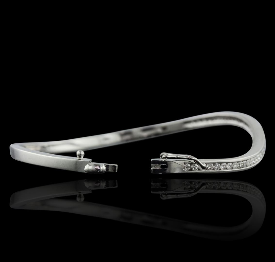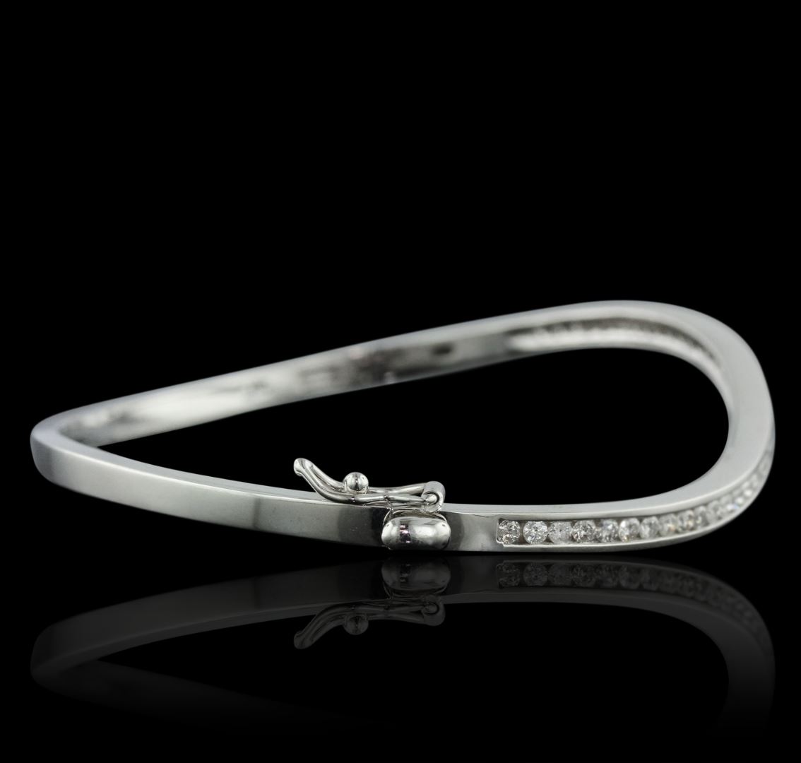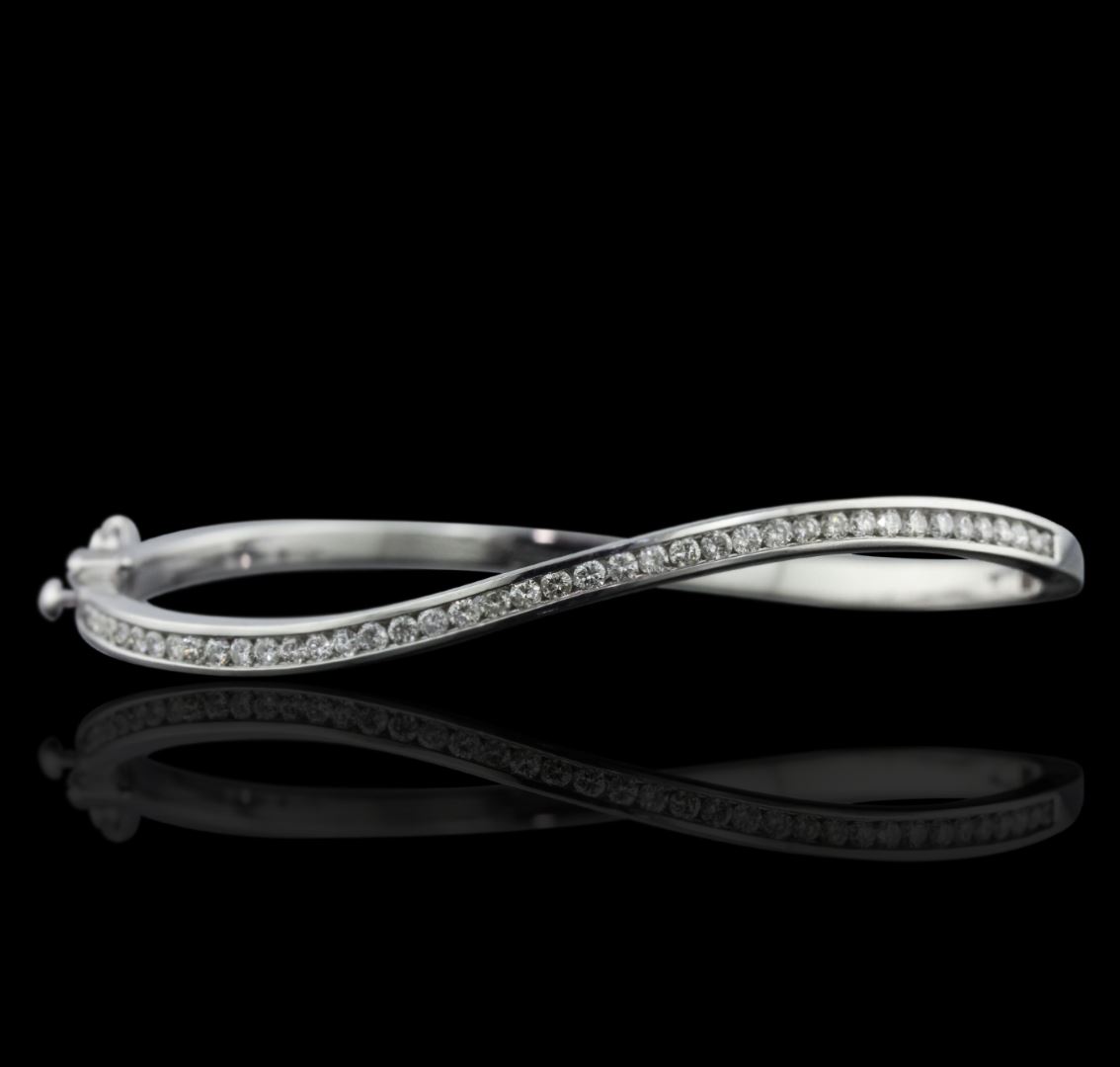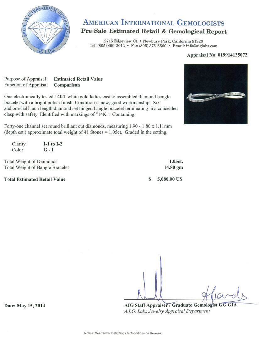 One electronically tested 14KT white gold ladies cast & assembled diamond bangle bracelet with a bright polish finish. Condition is new, good workmanship. Six and one-half inch length diamond set hinged bangle bracelet terminating in a concealed clasp with safety. Identified with markings of "14K". Containing: Forty-One channel set round brilliant cut diamonds, measuring 1.90 - 1.80 x 1.11mm (depth est.) approximate. Total Weight of 41 Stones = 1.05ct. Graded in the setting. Clarity: I-1 to I-2. Color: G - I. Total Weight of Diamonds 1.05ct. Total Weight of Bangle Bracelet 14.80 grams. AIG Appraised at $5,080.00.