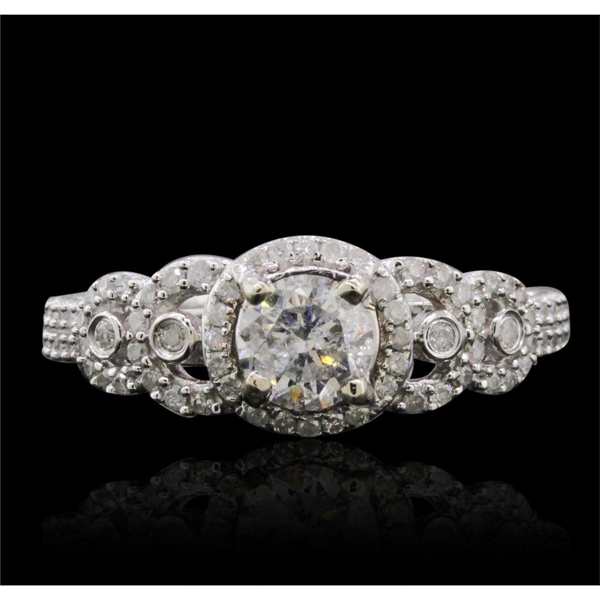 One electronically tested 14KT white gold ladies combination cast & assembled engagement ring with a flat shank with a bright polish finish. Identified with markings of "14K". Condition is new. Containing: One prong set round brilliant cut diamond, measuring 5.75 - 5.75 x 3.45mm (depth est.) approximate weight of 0.70ct. Clarity: I-2. Color: G, Cut is Good. Seventy-Three prong set round brilliant cut diamonds, measuring 1.10 - 1.10 x 0.66mm (depth est.) approximate total weight of 73 Stones = 0.35ct. Clarity: I-1 to I-2. Color: H - I, Cut is Good. All diamonds are graded in the mounting, unless otherwise stated. Total Weight of Diamonds 1.05ct. Total Weight of Ring 4.20 grams. GGL Appraised at $6,460.00.