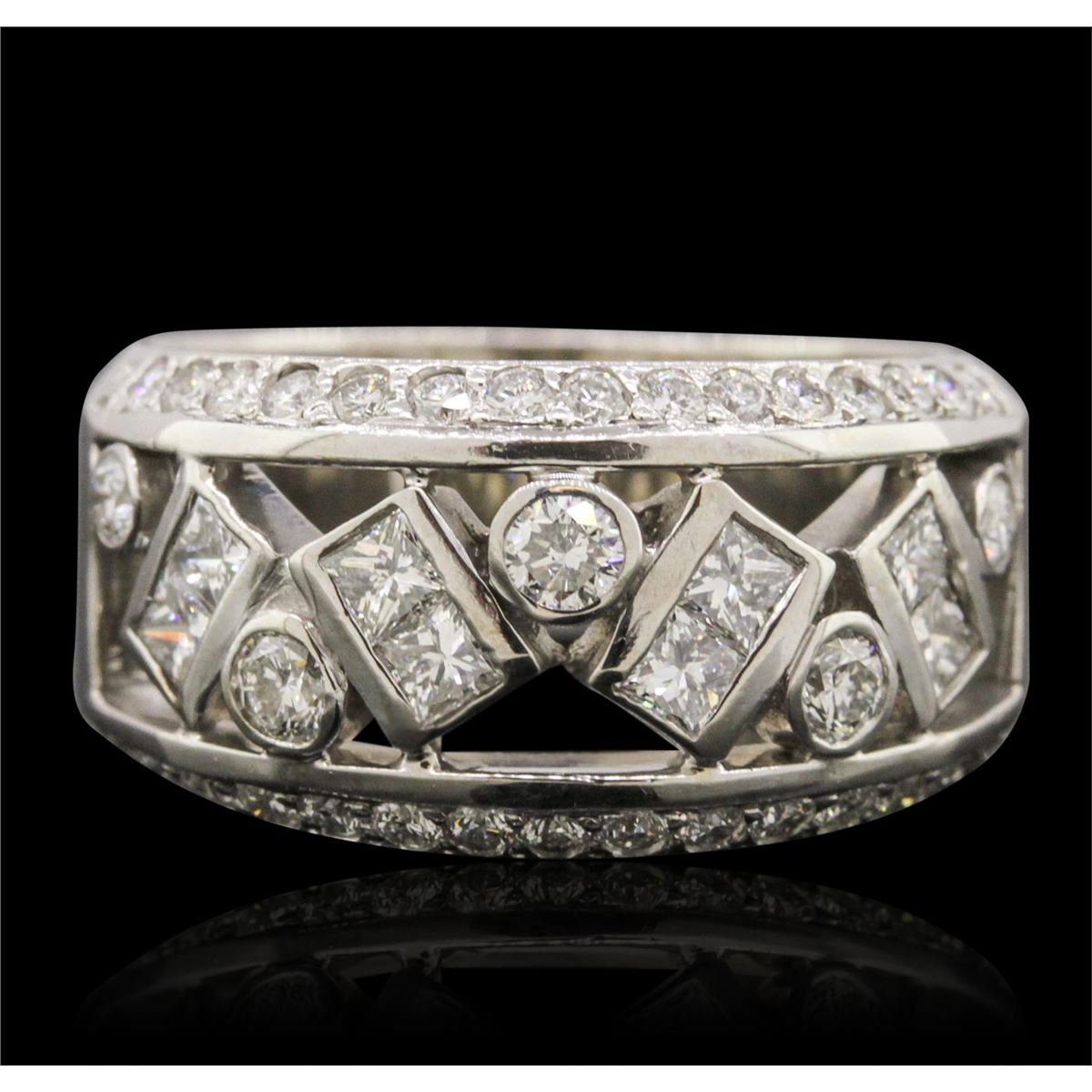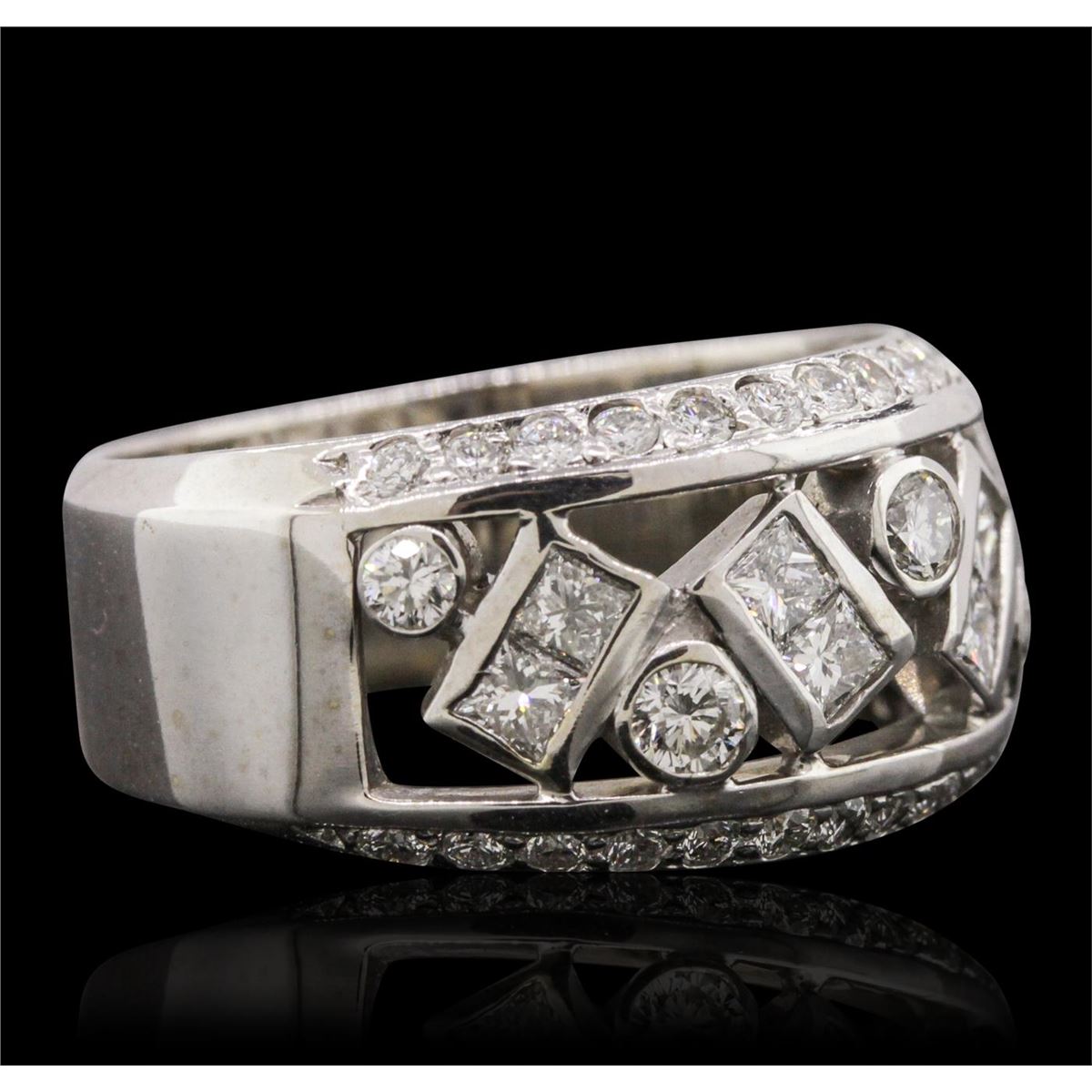 One electronically tested 14KT white gold Ladies combination cast & assembled ring with a bright polish finish. Condition is very good. Identified with markings of "14K". Containing: Eight channel set princess cut diamonds, measuring 2.00 x 2.00 x 1.50mm (depth est.) approximate. Total Weight of 8 Stones = 0.39ct. Clarity: VS-2. Color: H - I, Cut is Good. Five bezel set round brilliant cut diamonds, measuring 2.50 - 2.50 x 1.50mm (depth est.) approximate. Total Weight of 5 Stones = 0.29ct. Clarity: SI-1 to SI-2. Color: H - I, Cut is Good. Thirty bead set round brilliant cut diamonds, measuring 1.50 - 1.50 x 0.90mm (depth est.) approximate. Total Weight of 30 Stones = 0.37ct. Clarity: SI-1 to SI-2. Color: H - I, Cut is Good. All diamonds are graded in the mounting, unless otherwise stated. Total Weight of Diamonds 1.05ct. Total Weight of Ring 7.50 grams.. GGL Appraised at $5,570.00.