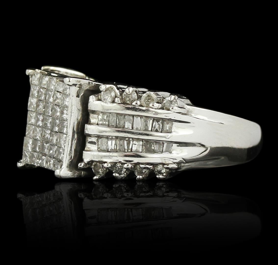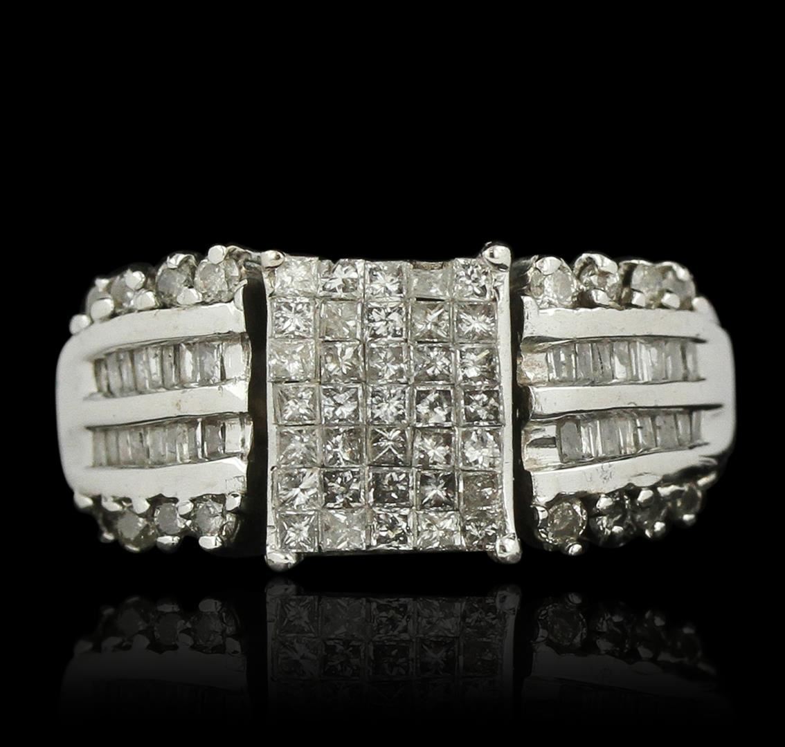 One electronically tested 14KT white gold lady's combination cast & assembled invisible set ring with a bright polish finish. Identified with markings of "14K". Condition is very good. Containing: Thirty-Five invisible set princess cut diamonds, measuring 1.40 x 1.40 x 1.05mm (depth est.) approximate total weight of 35 Stones = 0.59ct. Clarity of I-3, Color of H. Sixteen prong set round brilliant cut diamonds, measuring 1.50 - 1.40 x 0.87mm (depth est.) approximate total weight of 16 Stones = 0.18ct. Clarity of I-3, Color of I - J. Thirty-Two channel set baguette cut diamonds, measuring 1.50 x 0.80 x 0.68mm (depth est.) approximate total weight of 32 Stones = 0.28ct. Clarity of I-3, Color of I - J. Total Weight of Diamonds 1.05ct. Total Weight of Ring 8.00gm. GGL Appraised at $4,825.00.