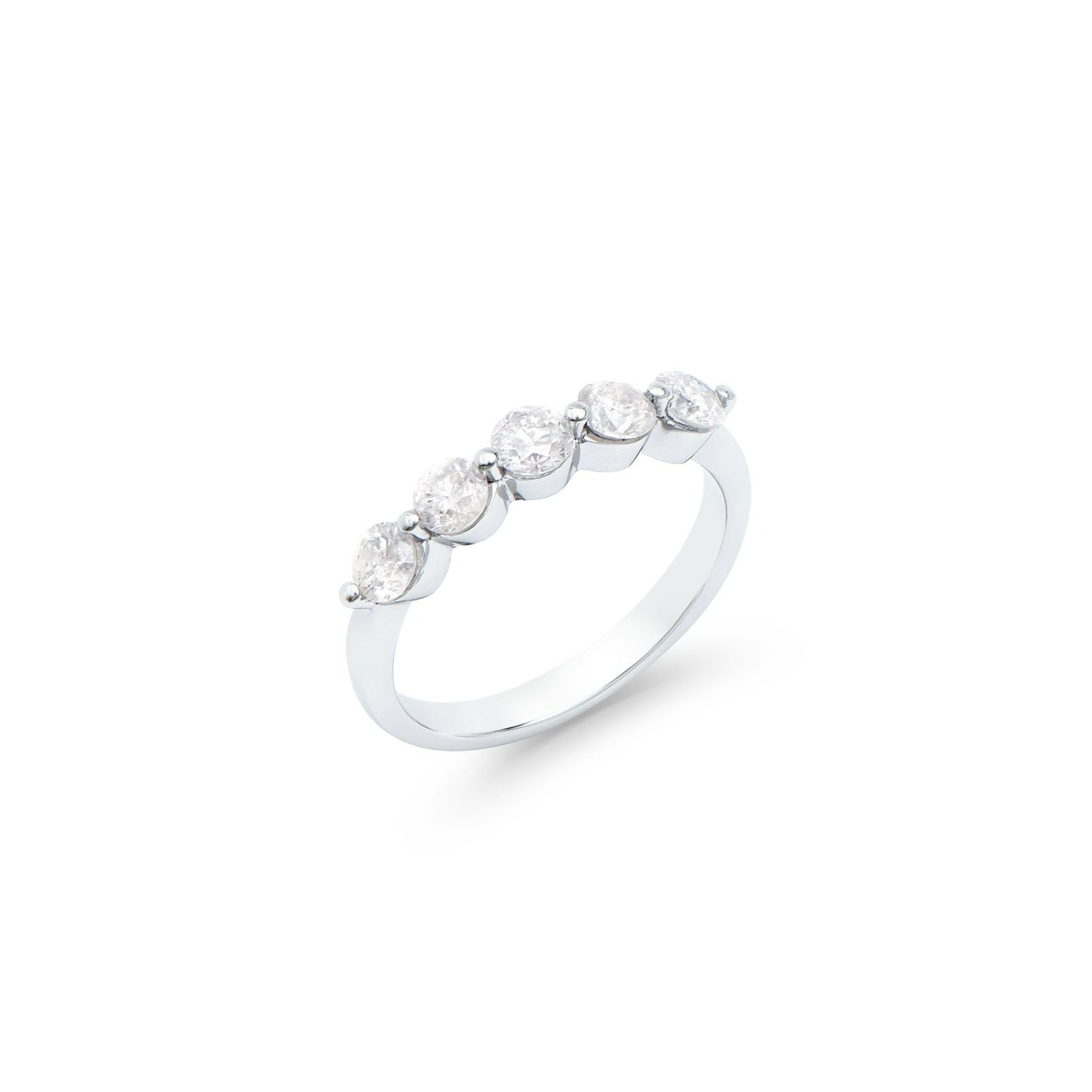 (5) round Diamonds with a total weight of 1.05cts with a color of H-I and clarity of I1-I2. Total weight of this ring is 2.7 grams. Ring size is 7.5.