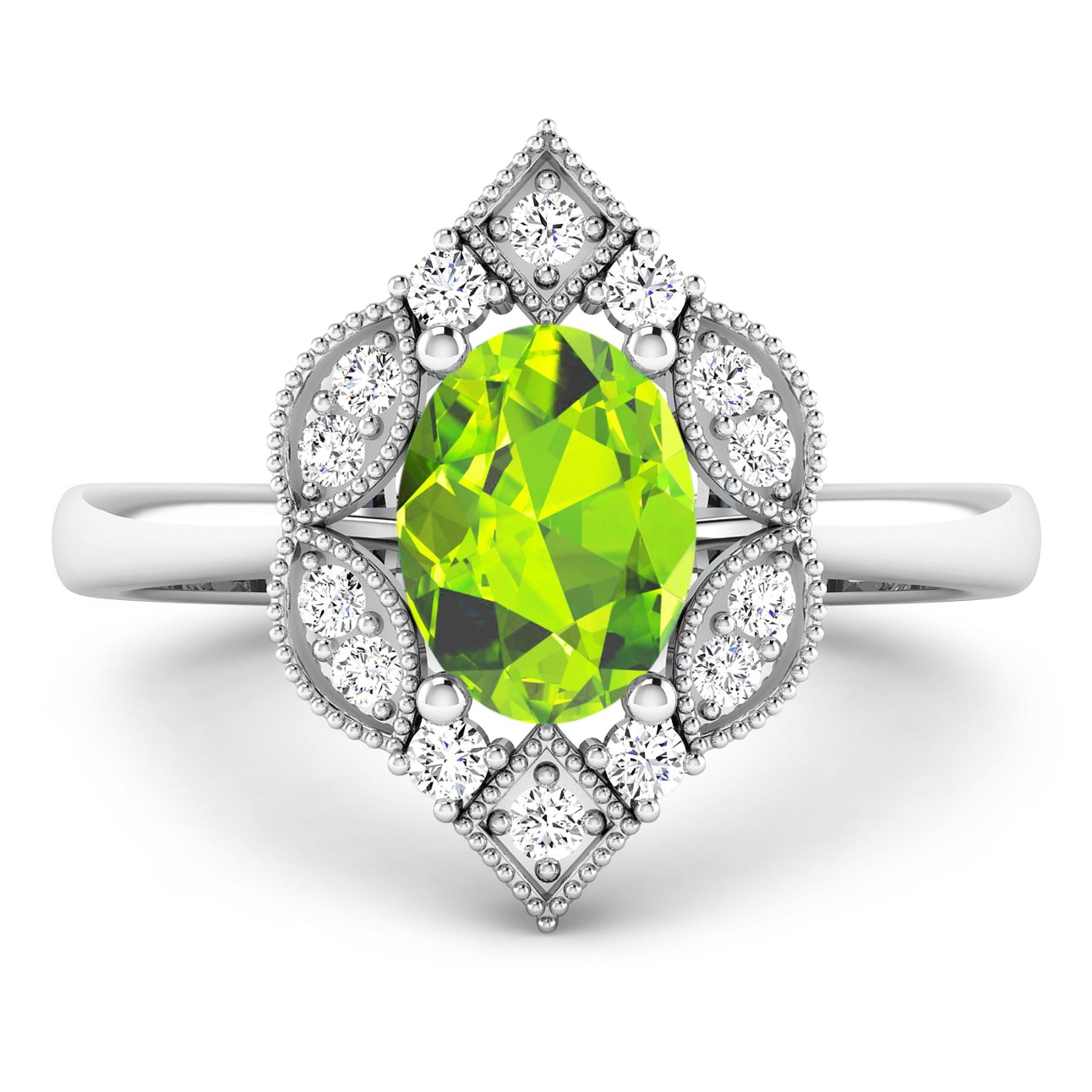 Peridot Oval 8x6mm - 1Pc + White Diamond F/C Round 1.50mm - 14Pcs ( I1-I2/I color ) Total weight of gemstone is 1.05cts. Total Diamond weight is 0.2cts. Total weight of this ring is 2.45 grams. Ring size 7.