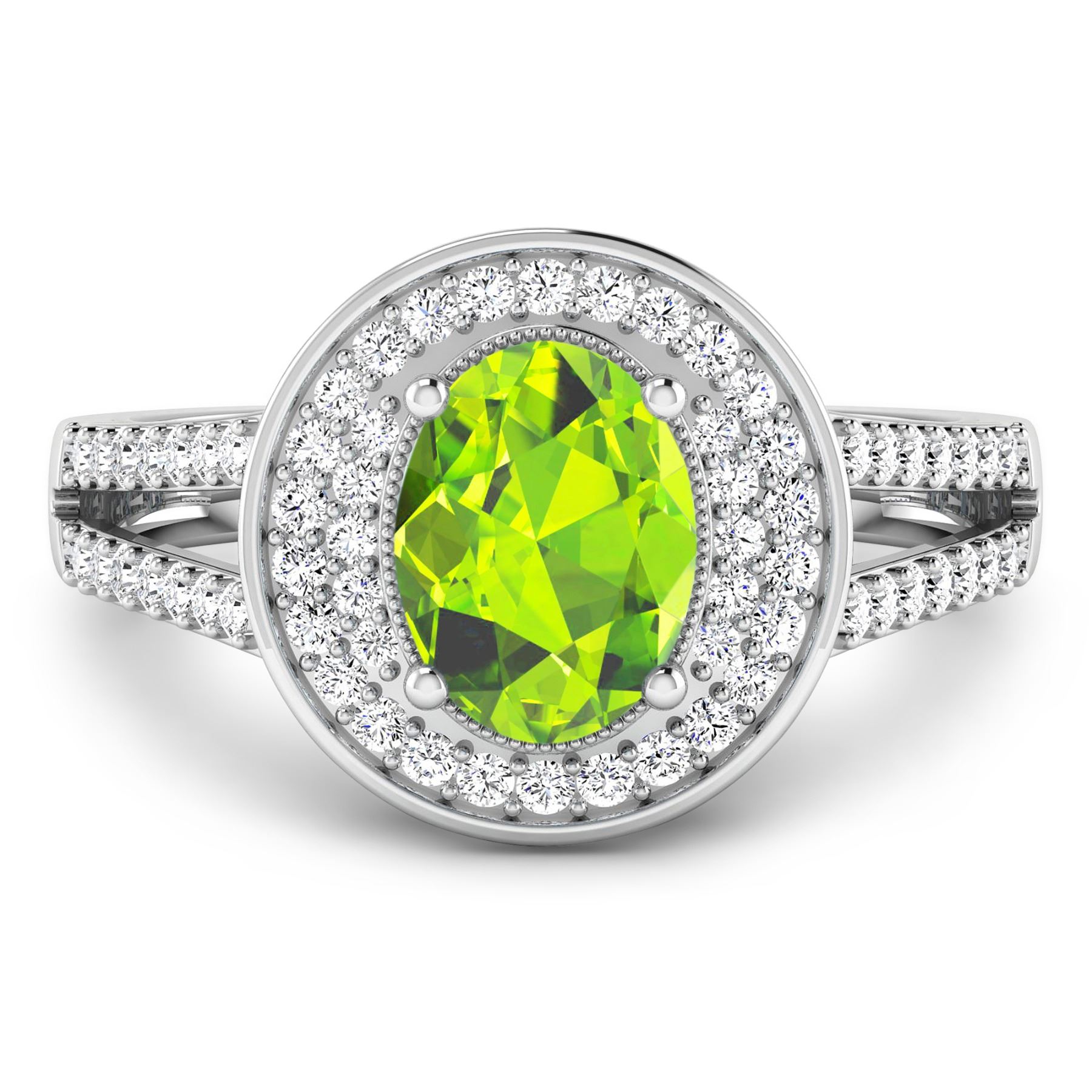 Peridot Oval 8x6mm - 1Pc + White Diamond F/C Round 1.10mm - 24Pcs + White Diamond F/C Round 1.00mm - 40Pcs ( I1-I2/I color ) Total weight of gemstone is 1.05cts. Total Diamond weight is 0.34cts. Total weight of this ring is 3.03 grams. Ring size 7.