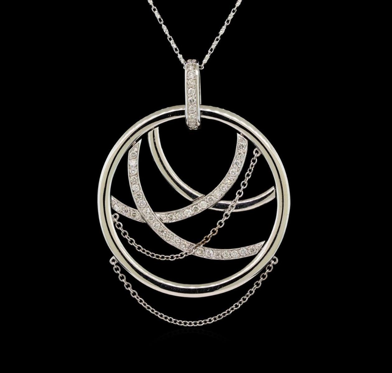 One electronically tested 14KT white gold ladies cast & assembled diamond pendant with chain. The pendant features an outer white gold circle with inner intertwining diamond ribbons and two white gold draping chains, completed by a diamond set bail. The pendant is supported by an eighteen inch length 14KT white gold designer style chain, terminating in a lobster claw clasp. Bright polish finish. Identified with markings of "585". Condition is new, good workmanship. Containing: Forty-Nine prong set round brilliant cut diamonds, measuring 1.80 - 1.70 x 1.05mm (depth est.) approximate total weight of 49 Stones = 1.06ct. Graded in the setting. Clarity: SI-1 to I-1. Color: G - I. Total Weight of Diamonds 1.06ct. Total Weight of Pendant With Chain 15.97 grams. AIG Appraised.