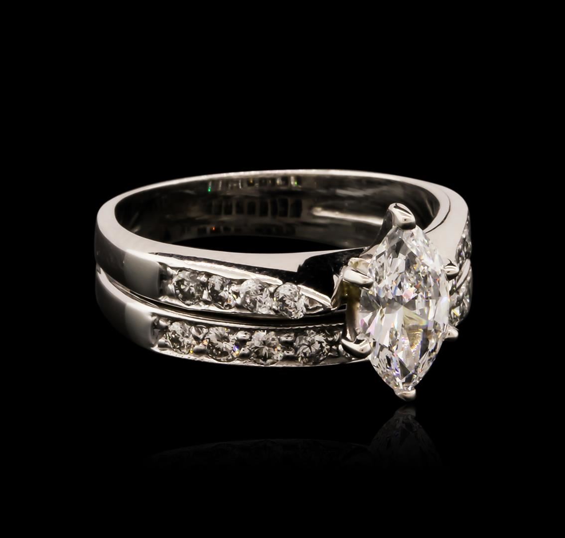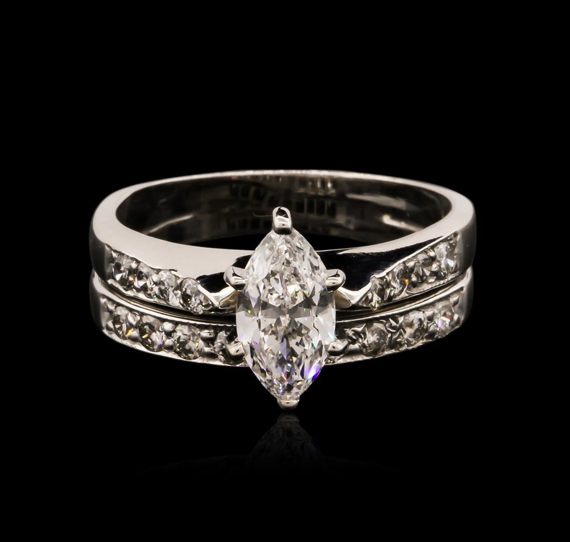 One electronically tested 14KT white gold ladies cast diamond engagement ring with a bright polish finish. Identified with markings of "14K". Condition is new. Containing: One prong set marquise shaped cut diamond, measuring 9.20 x 4.80 x 3.03mm (depth est.) approximate weight of 0.78ct. Clarity: SI-2. Color: J, Cut is Good. Seventeen prong set round brilliant cut diamonds, measuring 1.80 - 1.50 x 0.99mm (depth est.) approximate total weight of 17 Stones = 0.28ct. Clarity: SI-1 to I-1. Color: J - K, Cut is Good. All diamonds are graded in the mounting, unless otherwise stated. Total Weight of Diamonds 1.06ct. Total Weight of Engagement Ring 5.40 grams. GGL Appraised at $5,080.00.