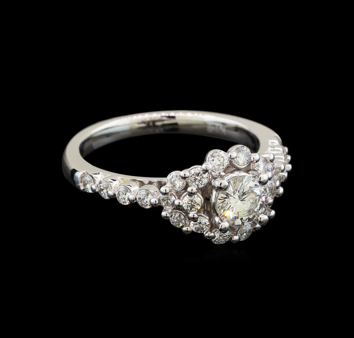 One electronically tested 14KT white gold ladies cast diamond engagement ring with a bright polish finish. Identified with markings of "14K". Condition is new. Containing: One prong set round brilliant cut diamond, measuring 5.00 - 5.00 x 3.00mm (depth est.) approximate weight of 0.46ct. Clarity: SI-2. Color: J, Cut is Good. Twenty-Four prong set round brilliant cut diamonds, measuring 1.90 - 1.90 x 1.14mm (depth est.) approximate total weight of 24 Stones = 0.60ct. Clarity: SI-2 to I-1. Color: G - H, Cut is Good. All diamonds are graded in the mounting, unless otherwise stated. Total Weight of Diamonds 1.06ct. Total Weight of Engagement Ring 4.10 grams. GGL Appraised at $4,670.00.