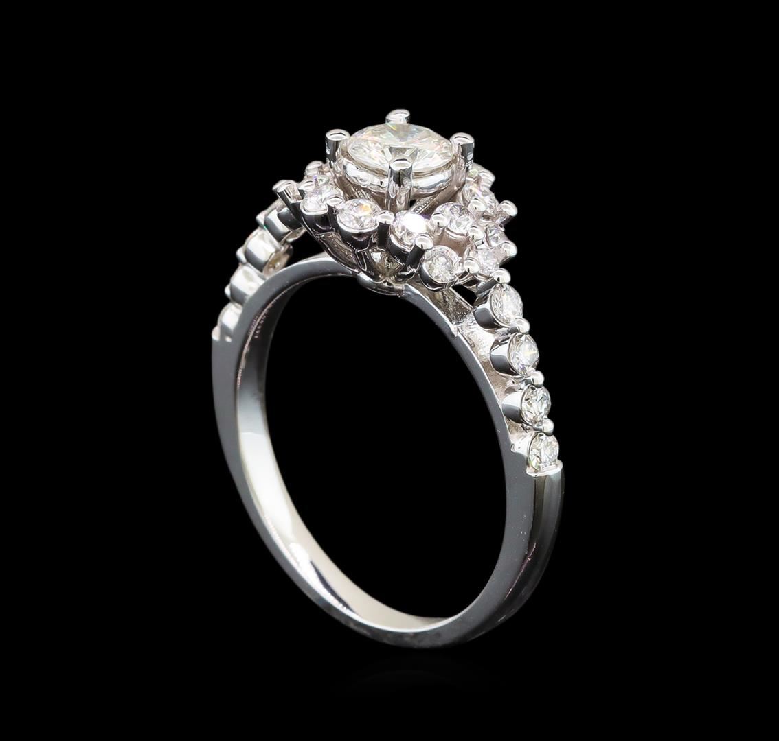 One electronically tested 14KT white gold ladies cast diamond engagement ring with a bright polish finish. Identified with markings of "14K". Condition is new. Containing: One prong set round brilliant cut diamond, measuring 5.00 - 5.00 x 3.00mm (depth est.) approximate weight of 0.46ct. Clarity: SI-2. Color: J, Cut is Good. Twenty-Four prong set round brilliant cut diamonds, measuring 1.90 - 1.90 x 1.14mm (depth est.) approximate total weight of 24 Stones = 0.60ct. Clarity: SI-2 to I-1. Color: G - H, Cut is Good. All diamonds are graded in the mounting, unless otherwise stated. Total Weight of Diamonds 1.06ct. Total Weight of Engagement Ring 4.10 grams. GGL Appraised at $4,670.00.