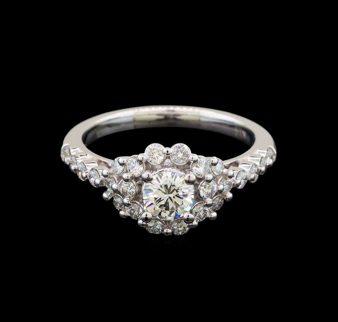 One electronically tested 14KT white gold ladies cast diamond engagement ring with a bright polish finish. Identified with markings of "14K". Condition is new. Containing: One prong set round brilliant cut diamond, measuring 5.00 - 5.00 x 3.00mm (depth est.) approximate weight of 0.46ct. Clarity: SI-2. Color: J, Cut is Good. Twenty-Four prong set round brilliant cut diamonds, measuring 1.90 - 1.90 x 1.14mm (depth est.) approximate total weight of 24 Stones = 0.60ct. Clarity: SI-2 to I-1. Color: G - H, Cut is Good. All diamonds are graded in the mounting, unless otherwise stated. Total Weight of Diamonds 1.06ct. Total Weight of Engagement Ring 4.10 grams. GGL Appraised at $4,670.00.