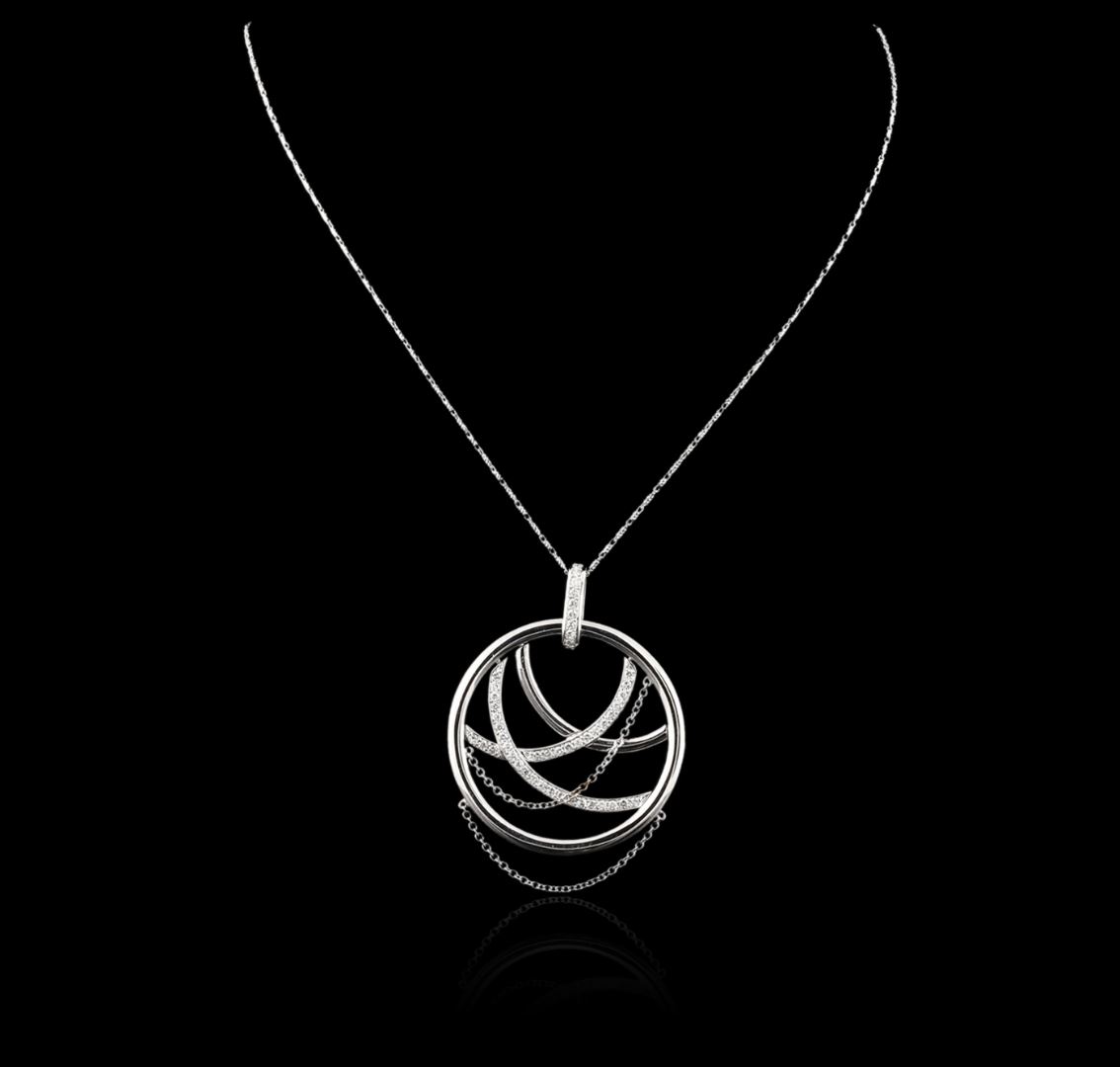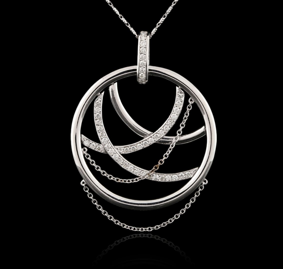 One electronically tested 14KT white gold ladies cast & assembled diamond pendant with chain. The pendant features an outer white gold circle with inner intertwining diamond ribbons and two white gold draping chains, completed by a diamond set bail. The pendant is supported by an eighteen inch length 14KT white gold designer style chain, terminating in a lobster claw clasp. Bright polish finish. Identified with markings of "585". Condition is new, good workmanship. Containing: Forty-Nine prong set round brilliant cut diamonds, measuring 1.80 - 1.70 x 1.05mm (depth est.) approximate total weight of 49 Stones = 1.06ct. Graded in the setting. Clarity: SI-1 to I-1. Color: G - I. Total Weight of Diamonds 1.06ct. Total Weight of Pendant With Chain 15.97 grams. AIG Appraised at $5,495.00.