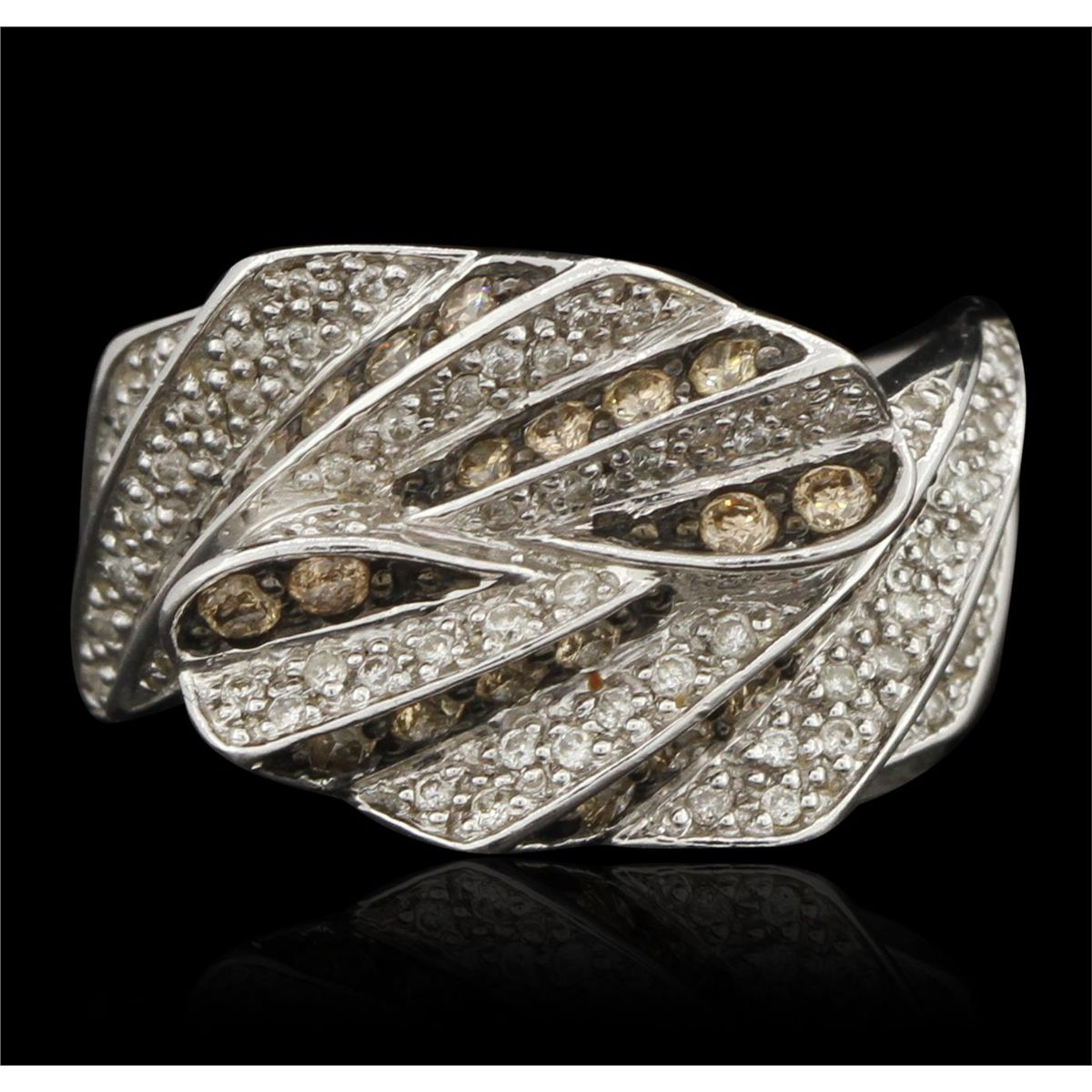One electronically tested 14KT white gold ladies cast diamond ring with a bright and anodized finish. Condition is good. The ring features intersecting diamond set steps, completed by a four and one-half millimeter wide band. Identified with markings of "14K 585". Containing: Thirty-six bead set round brilliant cut diamonds, measuring 2.00 - 1.50 x 1.05mm (depth est.) approximate total weight of 36 Stones = 0.80ct. Graded in the setting. Clarity SI-1 to I-1. Color Fancy Brown Sixty-two bead set round brilliant cut diamonds, measuring 1.00 - 0.90 x 0.57mm (depth est.) approximate total weight of 62 Stones = 0.26ct. Faint brown secondary color throughout. Graded in the setting. Clarity SI-1 to I-1. Color H - J. Total Weight of Diamonds 1.06ct. Total Weight of Ring 8.50gm. AIG Appraised at $4,400.00.