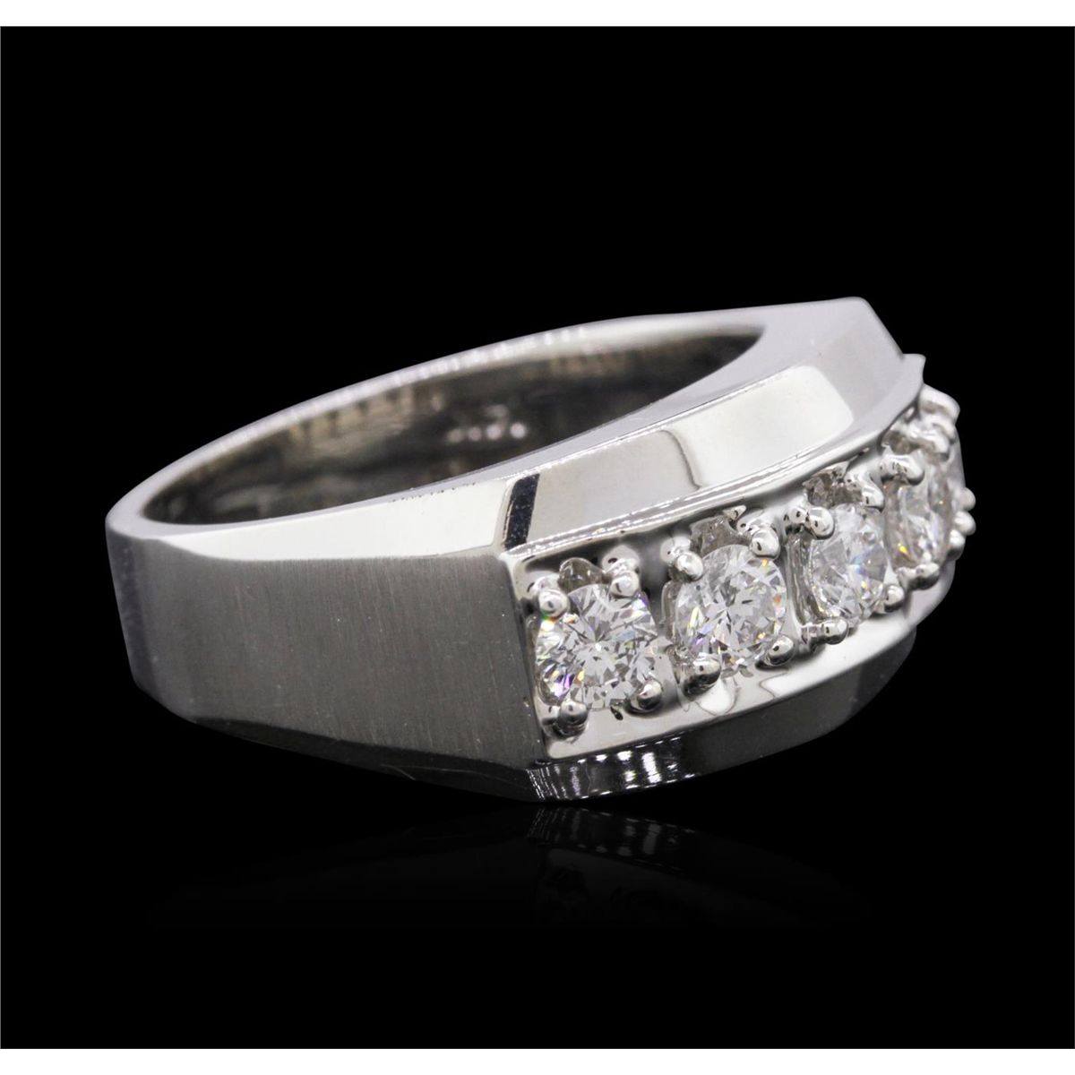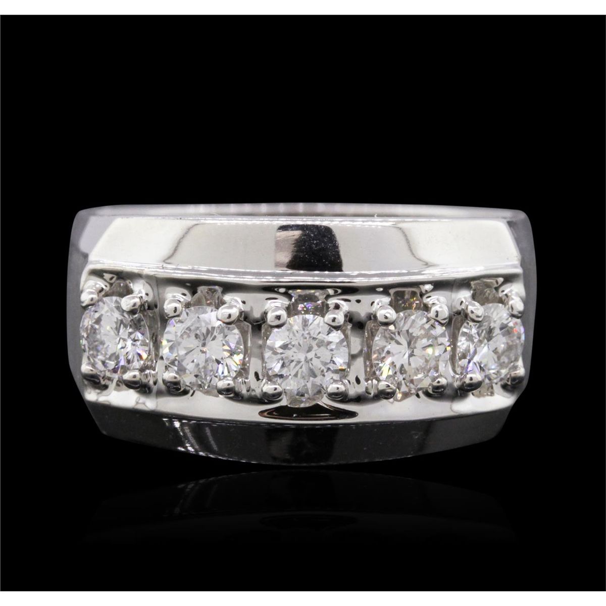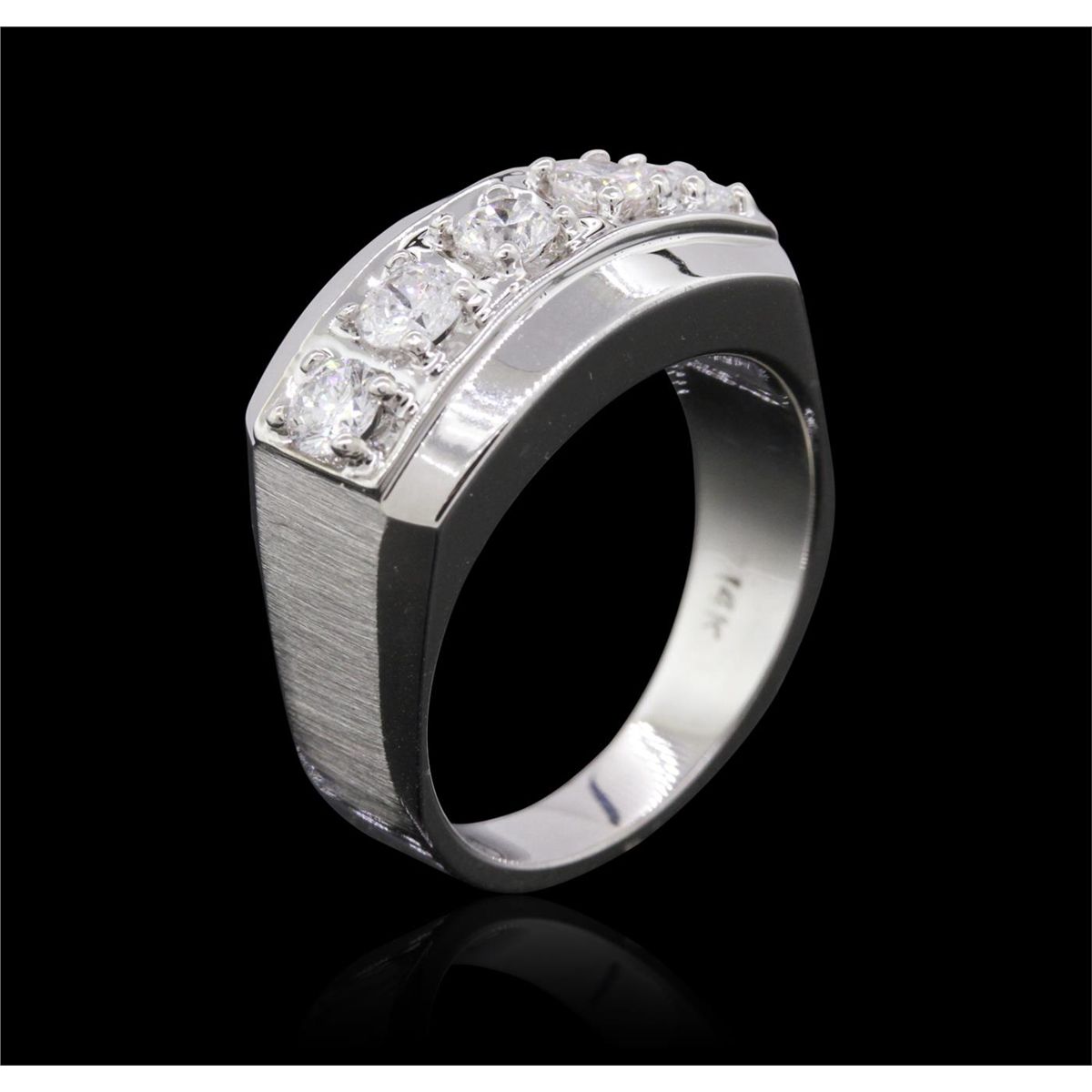 One electronically tested 14KT white gold gents cast diamond ring with a bright polish finish. The ring features a diamond set curvature, completed by a four millimeter wide band. Identified with markings of 14K. Condition is new, good workmanship. Containing: Five prong set round brilliant cut diamonds, measuring 3.80 - 3.70 x 2.25mm (depth est.) approximate total weight of 5 Stones = 1.06ct. Graded in the setting. Clarity: SI-2 to I-1. Color: G - I. Total Weight of Diamonds 1.06ct. Total Weight of Ring 11.78 grams. AIG Appraised at $5,860.00.