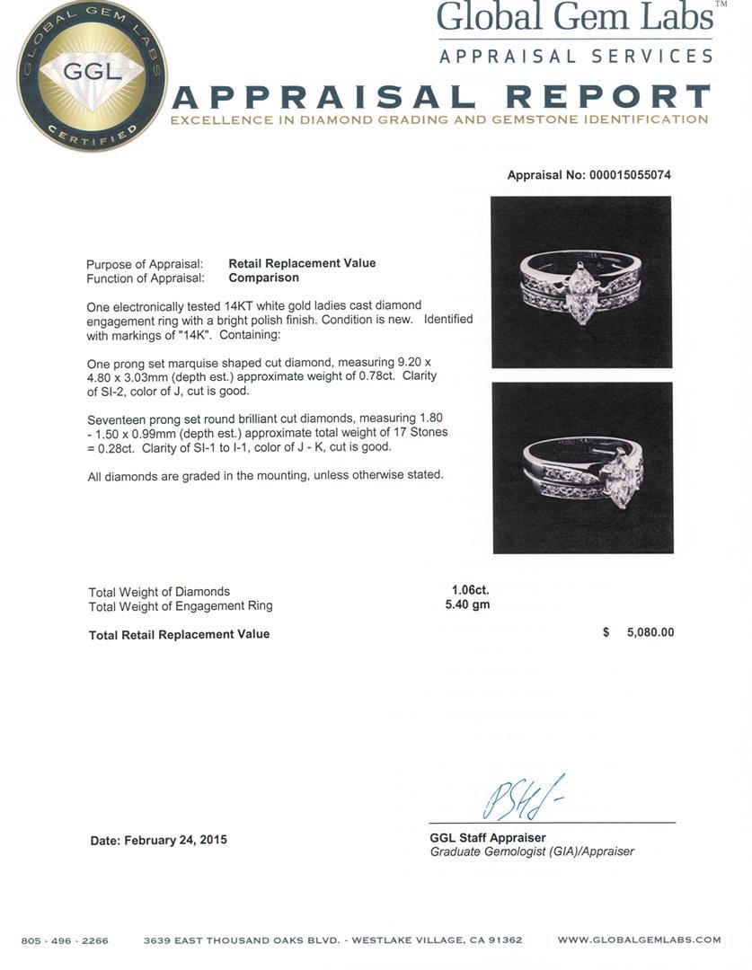 One electronically tested 14KT white gold ladies cast diamond engagement ring with a bright polish finish. Identified with markings of "14K". Condition is new. Containing: One prong set marquise shaped cut diamond, measuring 9.20 x 4.80 x 3.03mm (depth est.) approximate weight of 0.78ct. Clarity: SI-2. Color: J, Cut is Good. Seventeen prong set round brilliant cut diamonds, measuring 1.80 - 1.50 x 0.99mm (depth est.) approximate total weight of 17 Stones = 0.28ct. Clarity: SI-1 to I-1. Color: J - K, Cut is Good. All diamonds are graded in the mounting, unless otherwise stated. Total Weight of Diamonds 1.06ct. Total Weight of Engagement Ring 5.40 grams. GGL Appraised at $5,080.00.