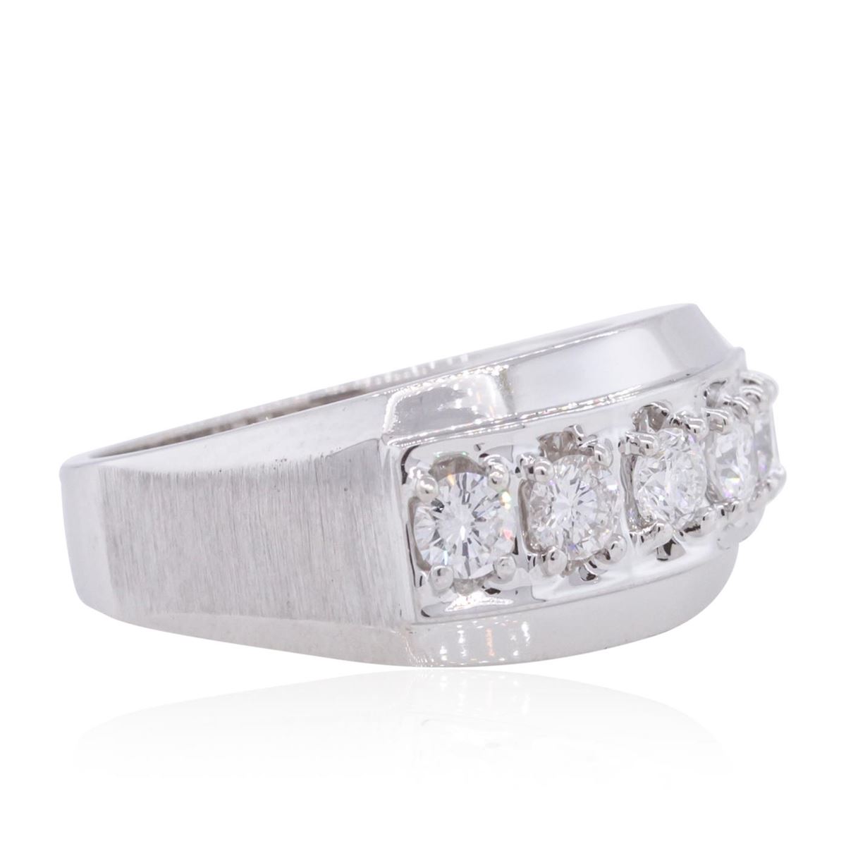 One electronically tested 14KT white gold gents cast diamond ring with a bright polish finish. The ring features a diamond set curvature, completed by a four millimeter wide band. Identified with markings of 14K. Condition is new, good workmanship. Containing: Five prong set round brilliant cut diamonds, measuring 3.80 - 3.70 x 2.25mm (depth est.) approximate total weight of 5 Stones = 1.06ct. Graded in the setting. Clarity: SI-2 to I-1. Color: G - I. Total Weight of Diamonds 1.06ct. Total Weight of Ring 11.78 grams. AIG Appraised at $5,860.00.