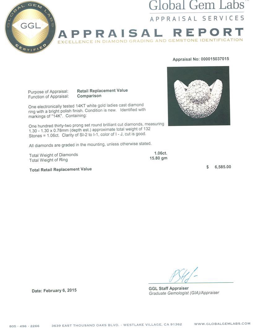 One electronically tested 14KT white gold ladies cast diamond ring with a bright polish finish. Identified with markings of "14K". Condition is new. Containing: One Hundred Thirty-Two prong set round brilliant cut diamonds, measuring 1.30 - 1.30 x 0.78mm (depth est.) approximate total weight of 132 Stones = 1.06ct. Clarity: SI-2 to I-1. Color: I - J, Cut is Good. All diamonds are graded in the mounting, unless otherwise stated. Total Weight of Diamonds 1.06ct. Total Weight of Ring 15.80 grams. GGL Appraised at $6,585.00.