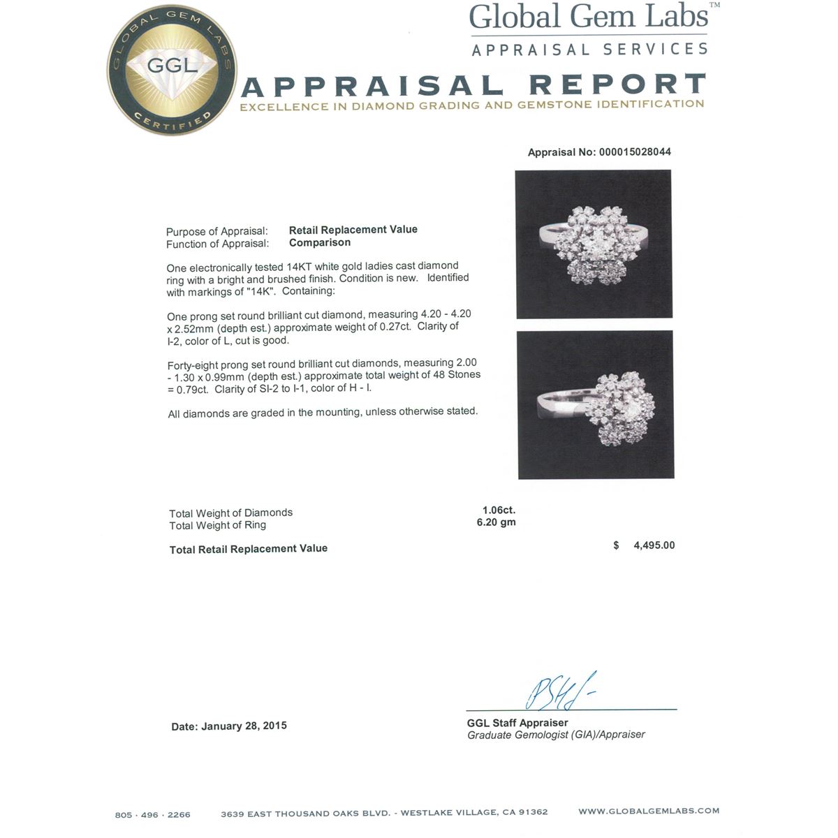 One electronically tested 14KT white gold ladies cast diamond ring with a bright and brushed finish. Identified with markings of "14K". Condition is new. Containing: One prong set round brilliant cut diamond, measuring 4.20 - 4.20 x 2.52mm (depth est.) approximate weight of 0.27ct. Clarity: I-2. Color: L, Cut is Good. Forty-Eight prong set round brilliant cut diamonds, measuring 2.00 - 1.30 x 0.99mm (depth est.) approximate total weight of 48 Stones = 0.79ct. Clarity: SI-2 to I-1. Color: H - I. All diamonds are graded in the mounting, unless otherwise stated. Total Weight of Diamonds 1.06ct. Total Weight of Ring 6.20 grams. GGL Appraised at $4,495.00.