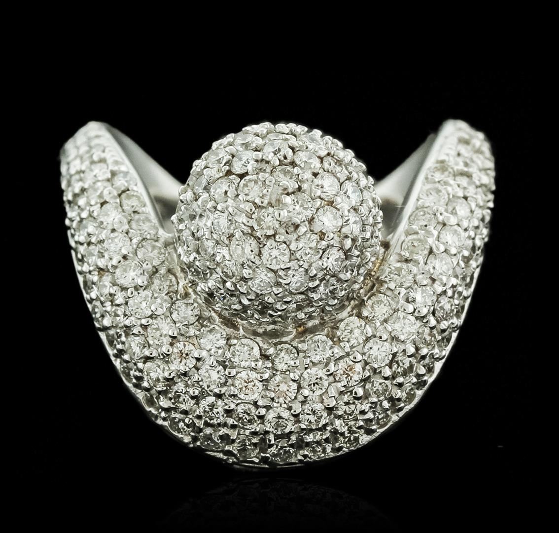 One electronically tested 14KT white gold ladies cast diamond ring with a bright polish finish. Identified with markings of "14K". Condition is new. Containing: One Hundred Thirty-Two prong set round brilliant cut diamonds, measuring 1.30 - 1.30 x 0.78mm (depth est.) approximate total weight of 132 Stones = 1.06ct. Clarity: SI-2 to I-1. Color: I - J, Cut is Good. All diamonds are graded in the mounting, unless otherwise stated. Total Weight of Diamonds 1.06ct. Total Weight of Ring 15.80 grams. GGL Appraised at $6,585.00.