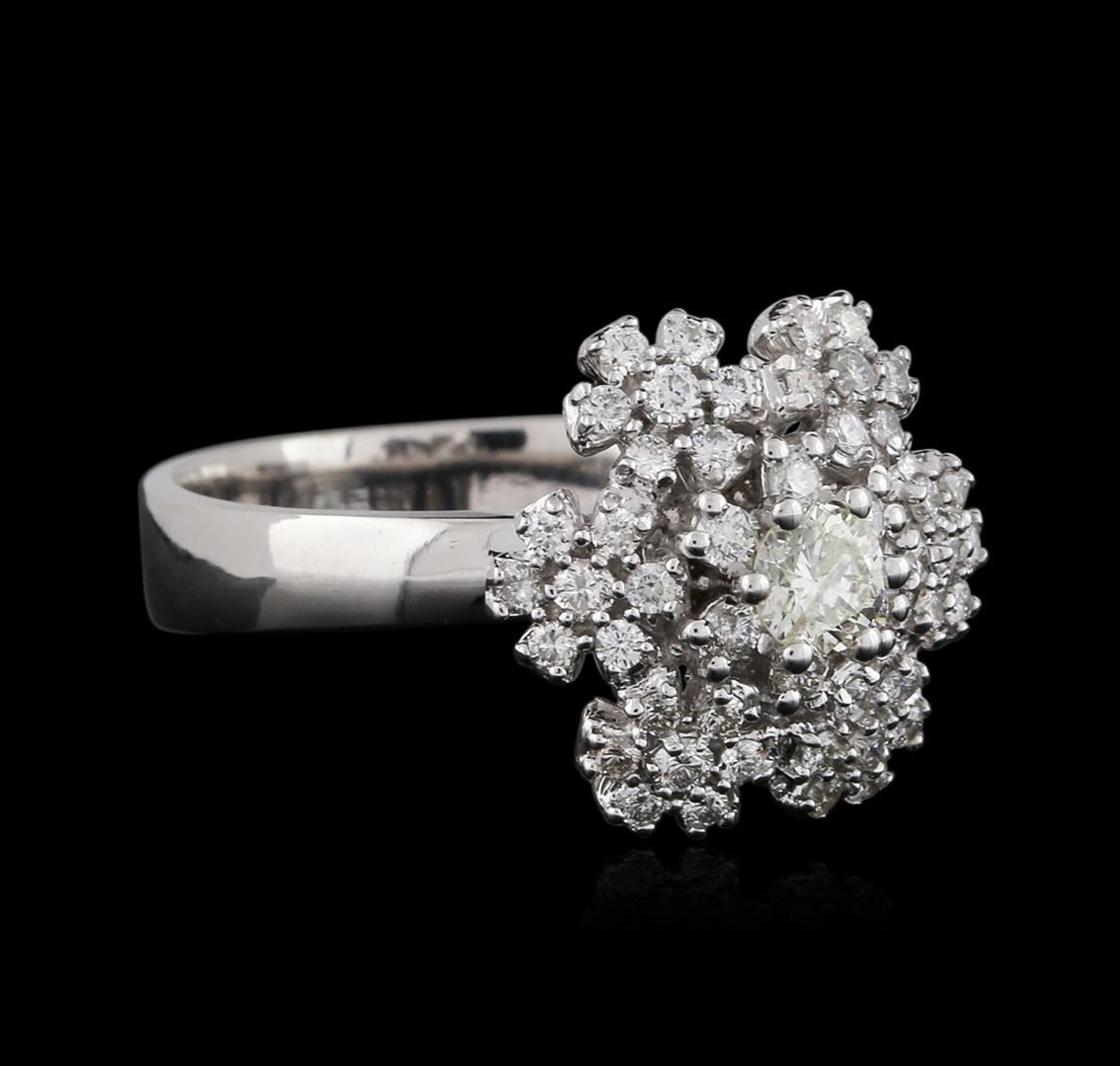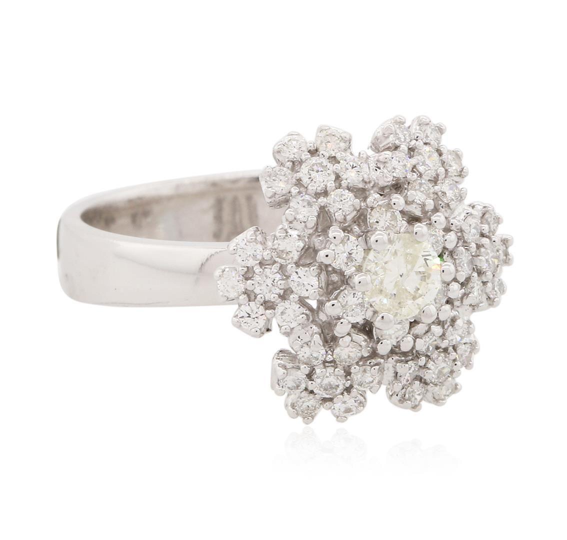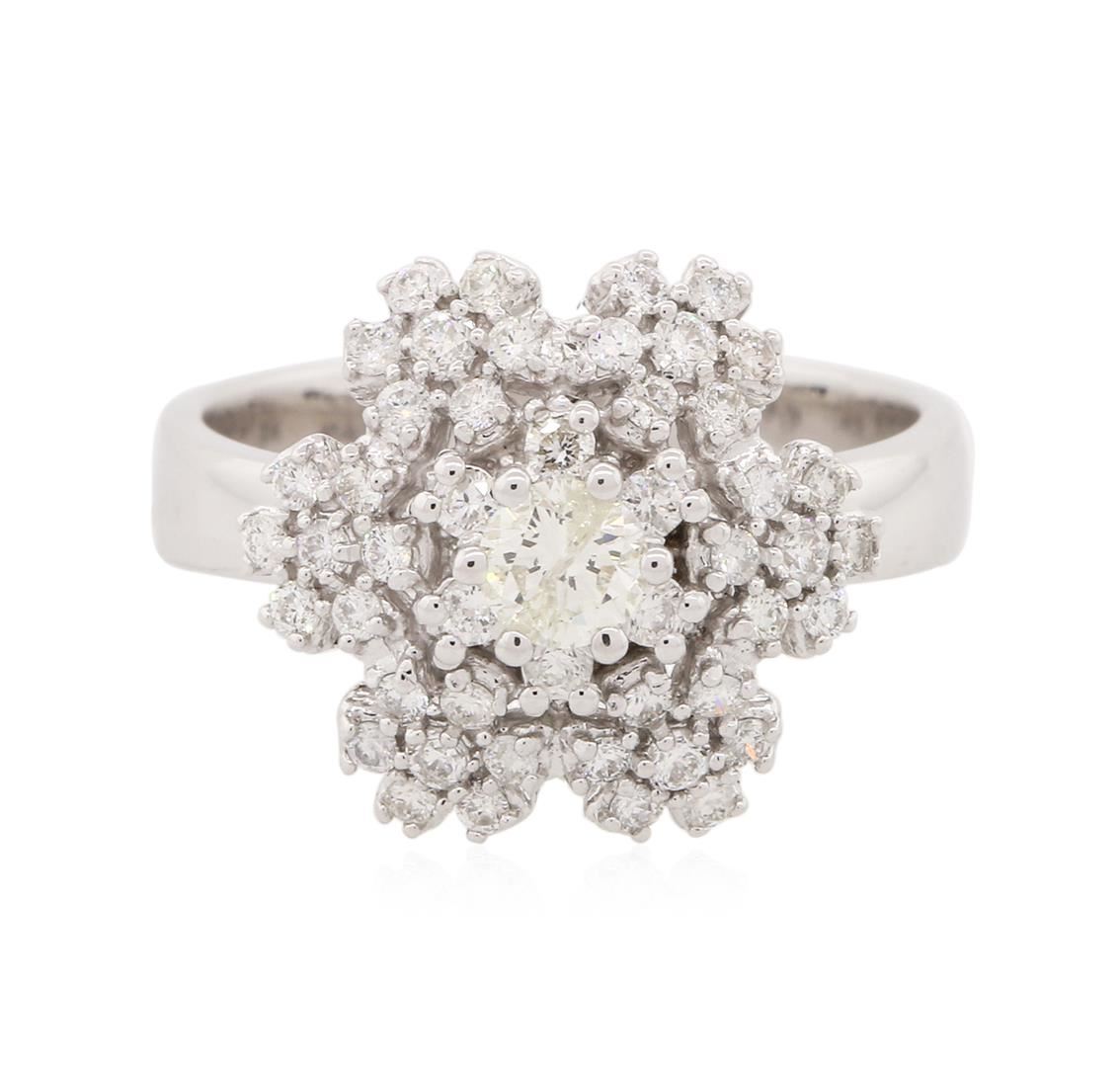 One electronically tested 14KT white gold ladies cast diamond ring with a bright and brushed finish. Identified with markings of "14K". Condition is new. Containing: One prong set round brilliant cut diamond, measuring 4.20 - 4.20 x 2.52mm (depth est.) approximate weight of 0.27ct. Clarity: I-2. Color: L, Cut is Good. Forty-Eight prong set round brilliant cut diamonds, measuring 2.00 - 1.30 x 0.99mm (depth est.) approximate total weight of 48 Stones = 0.79ct. Clarity: SI-2 to I-1. Color: H - I. All diamonds are graded in the mounting, unless otherwise stated. Total Weight of Diamonds 1.06ct. Total Weight of Ring 6.20 grams. GGL Appraised at $4,495.00.