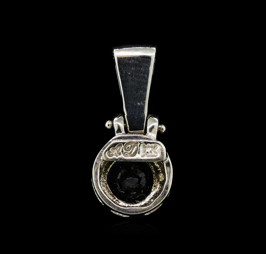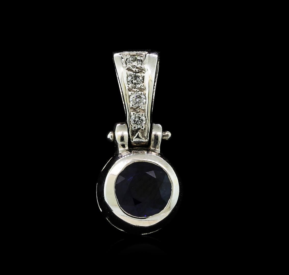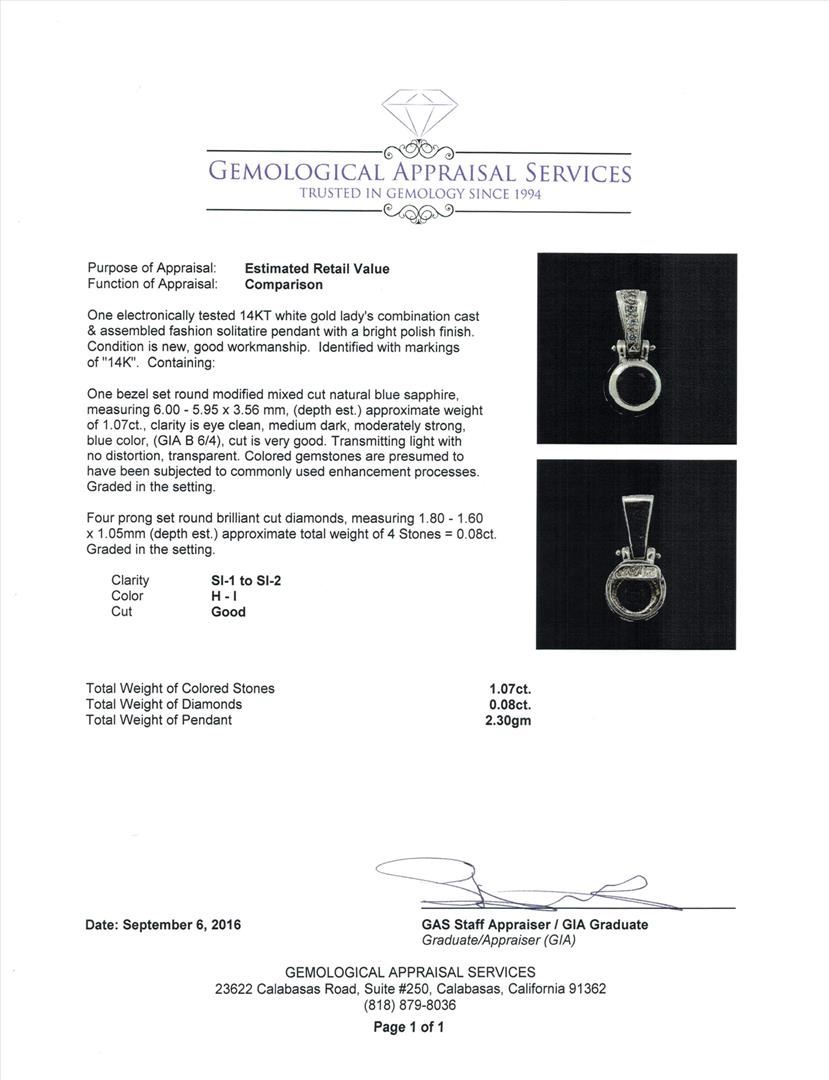 One electronically tested 14KT white gold lady's combination cast & assembled fashion solitatire pendant with a bright polish finish. Identified with markings of "14K". Condition is new, good workmanship. Containing: One bezel set round modified mixed cut natural blue sapphire, measuring 6.00 - 5.95 x 3.56 mm, (depth est.) approximate weight of 1.07ct., clarity is eye clean, medium dark, moderately strong, blue color, (GIA B 6/4), cut is very good. Transmitting light with no distortion, transparent. Colored gemstones are presumed to have been subjected to commonly used enhancement processes. Graded in the setting.Four prong set round brilliant cut diamonds, measuring 1.80 - 1.60 x 1.05mm (depth est.) approximate total weight of 4 Stones = 0.08ct. Graded in the setting. Clarity: SI-1 to SI-2. Color: H - ICut Good. Total Weight of Colored Stones 1.07ct. Total Weight of Diamonds 0.08ct. Total Weight of Pendant 2.30gm. GAS Appraised.