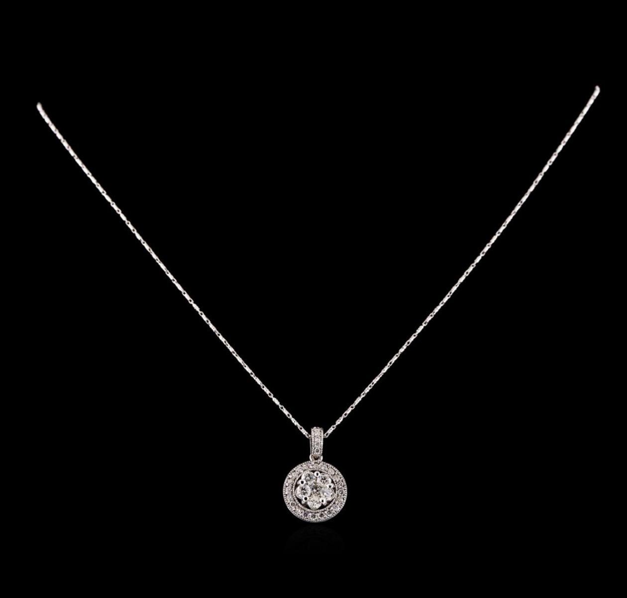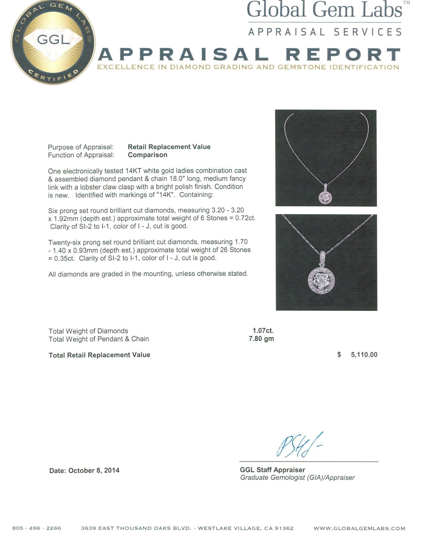 One electronically tested 14KT white gold ladies combination cast & assembled diamond pendant & chain 18.0" long, medium fancy link with a lobster claw clasp with a bright polish finish. Identified with markings of "14K". Condition is new. Containing: Six prong set round brilliant cut diamonds, measuring 3.20 - 3.20 x 1.92mm (depth est.) approximate total weight of 6 Stones = 0.72ct. Clarity: SI-2 to I-1. Color: I - J, Cut is Good. Twenty-Six prong set round brilliant cut diamonds, measuring 1.70 - 1.40 x 0.93mm (depth est.) approximate total weight of 26 Stones = 0.35ct. Clarity: SI-2 to I-1. Color: I - J, Cut is Good. All diamonds are graded in the mounting, unless otherwise stated. Total Weight of Diamonds 1.07ct. Total Weight of Pendant & Chain 7.80 grams. GGL Appraised.