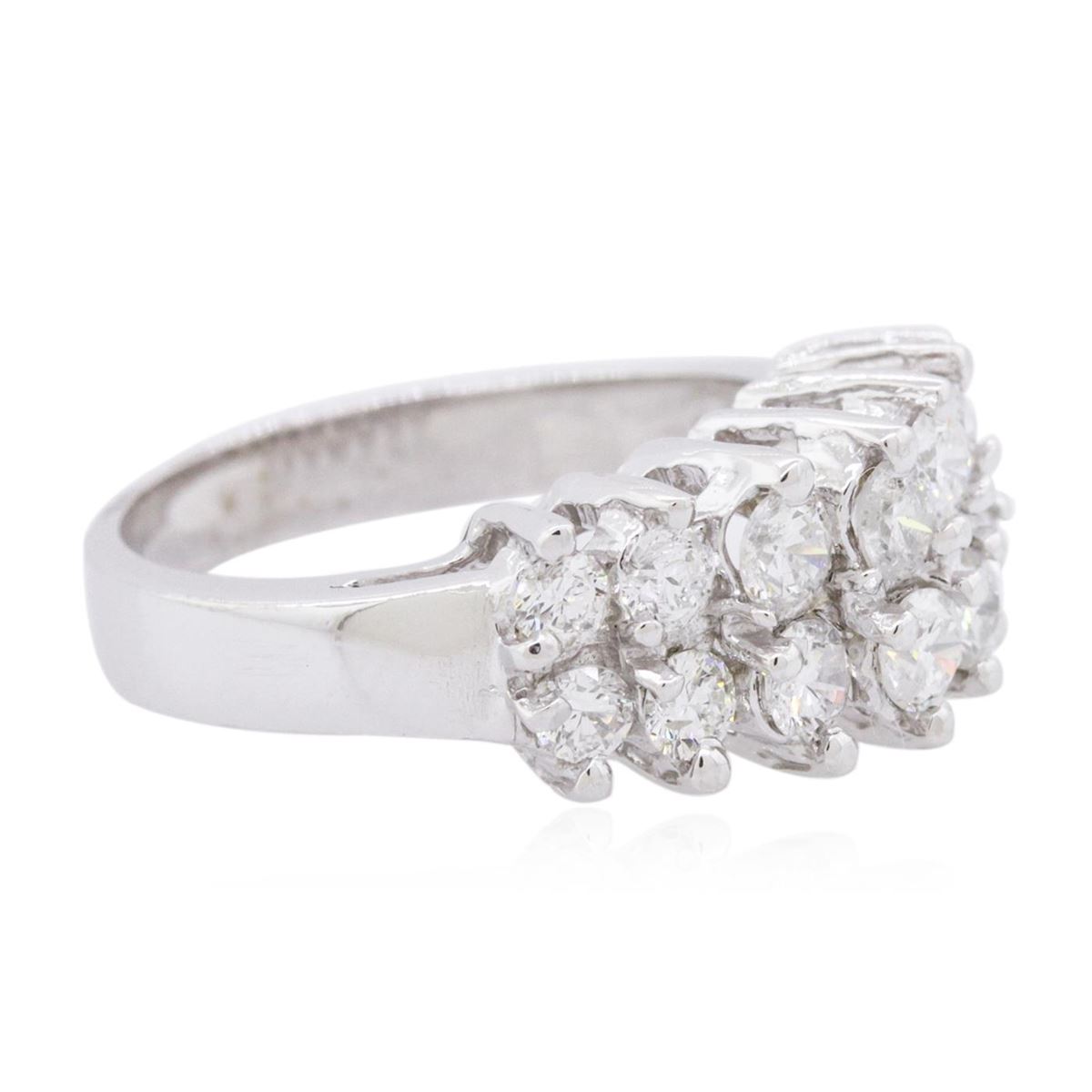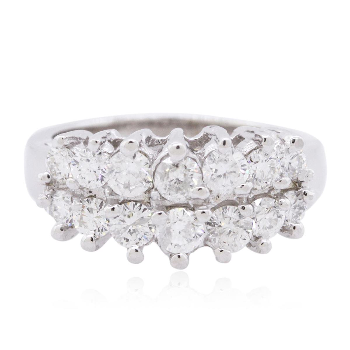 One electronically tested 14KT white gold ladies cast diamond ring with a bright polish finish. Identified with markings of "14K". Condition is new. Containing: Fourteen prong set round brilliant cut diamonds, measuring 3.00 - 2.50 x 1.65mm (depth est.) approximate total weight of 14 Stones = 1.07ct. Clarity: SI-2 to I-1. Color: I - J, Cut is Good. All diamonds are graded in the mounting, unless otherwise stated. Total Weight of Diamonds 1.07ct. Total Weight of Ring 5.60 grams. GGL Appraised at $4,220.00.