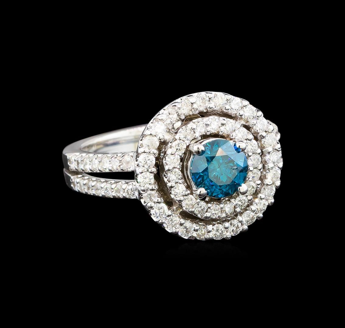 One electronically tested 14KT white gold ladies cast diamond engagement ring with a bright polish finish. Identified with markings of "14K". Condition is new. Containing: One prong set round brilliant cut diamond, measuring 5.10 - 5.10 x 3.06mm (depth est.) approximate weight of 0.49ct. Clarity: I-2, Cut is Good. The color of the stone has been treated. Seventy-Three prong set round brilliant cut diamonds, measuring 1.30 - 1.30 x 0.78mm (depth est.) approximate total weight of 73 Stones = 0.58ct. Clarity: SI-2 to I-2. Color: H - I, Cut is Good. All diamonds are graded in the mounting, unless otherwise stated. Total Weight of Diamonds 1.07ct. Total Weight of Engagement Ring 7.10 grams. GGL Appraised at $4,750.00.