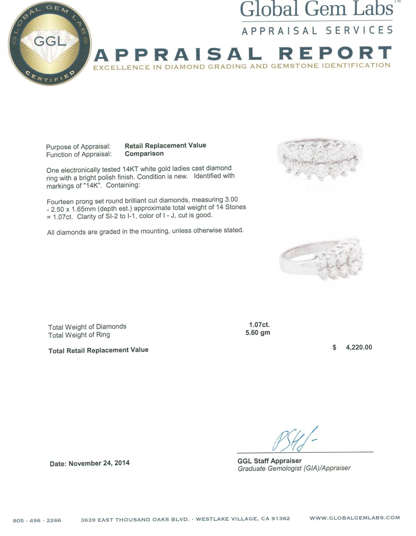 One electronically tested 14KT white gold ladies cast diamond ring with a bright polish finish. Identified with markings of "14K". Condition is new. Containing: Fourteen prong set round brilliant cut diamonds, measuring 3.00 - 2.50 x 1.65mm (depth est.) approximate total weight of 14 Stones = 1.07ct. Clarity: SI-2 to I-1. Color: I - J, Cut is Good. All diamonds are graded in the mounting, unless otherwise stated. Total Weight of Diamonds 1.07ct. Total Weight of Ring 5.60 grams. GGL Appraised.
