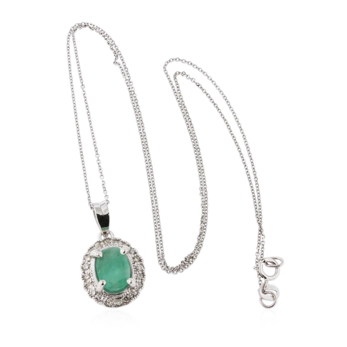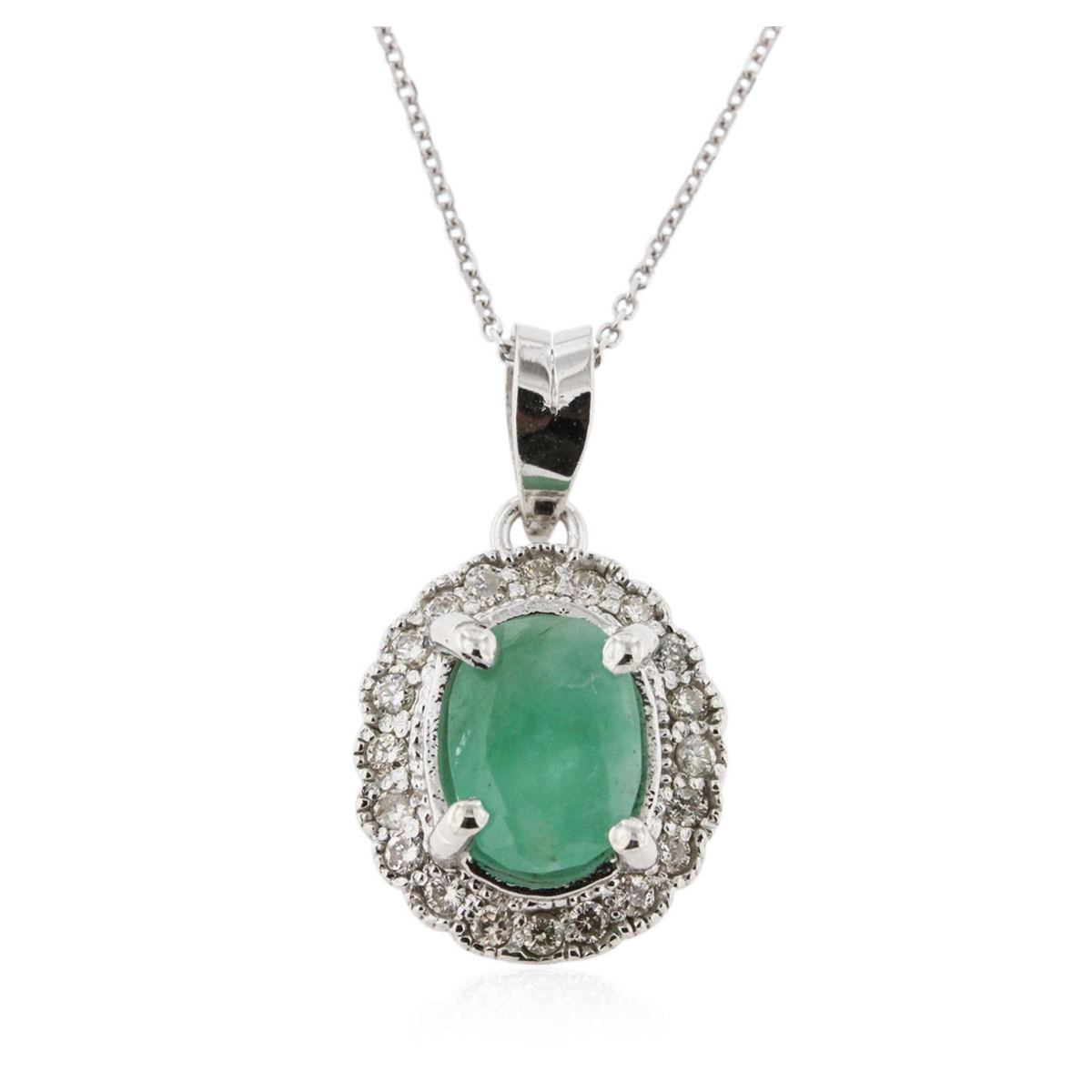 One electronically tested 14KT white gold ladies cast emerald and diamond pendant & chain 16.0" long, cable link with a spring ring clasp with a bright polish finish. Identified with markings of "14K". Condition is new. Containing: One prong set oval modified brilliant cut natural emerald, measuring 8.00 x 6.00 x 3.90mm, approximate weight of 1.07ct., clarity is heavily included, type III, medium, very slightly grayish, green color, (GIA G 5/3), cut is good. Twenty prong set round brilliant cut diamonds, measuring 1.30 - 1.30 x 0.78mm (depth est.) approximate total weight of 20 Stones = 0.16ct. Clarity: SI-1 to SI-2. Color: K - L. Colored gemstones are presumed to have been subjected to commonly used enhancement processes, All diamonds and colored gemstones are graded in the mounting, unless otherwise stated. Total Weight of Colored Stones 1.07ct. Total Weight of Diamonds 0.16ct. Total Weight of Pendant & Chain 3.20 grams. GGL Appraised at $1,890.00.