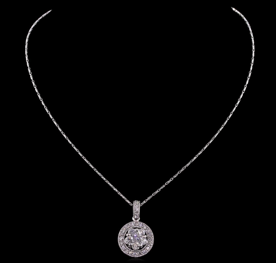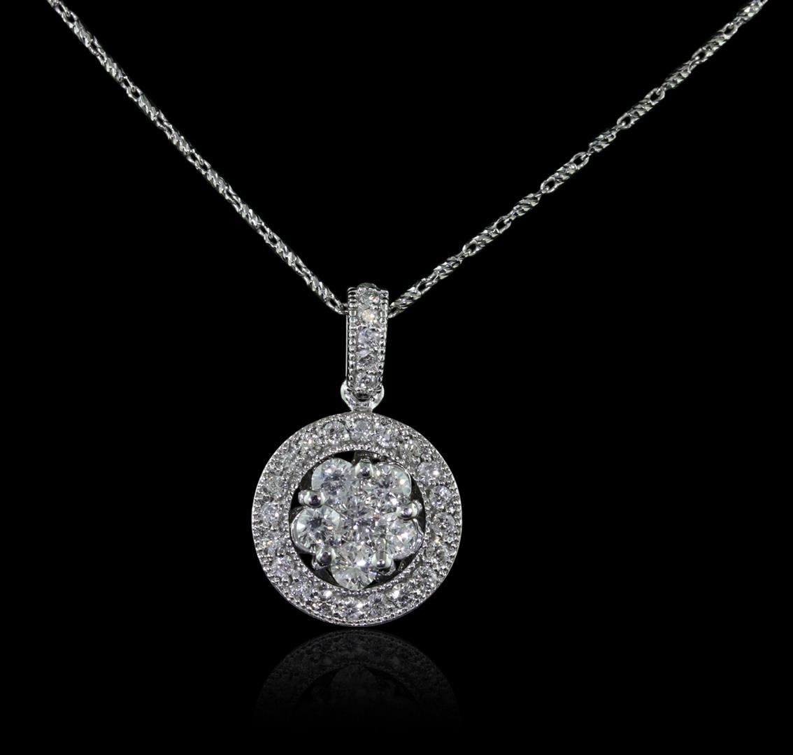 One electronically tested 14KT white gold ladies combination cast & assembled diamond pendant & chain 18.0" long, medium fancy link with a lobster claw clasp with a bright polish finish. Identified with markings of "14K". Condition is new. Containing: Six prong set round brilliant cut diamonds, measuring 3.20 - 3.20 x 1.92mm (depth est.) approximate total weight of 6 Stones = 0.72ct. Clarity: SI-2 to I-1. Color: I - J, Cut is Good. Twenty-Six prong set round brilliant cut diamonds, measuring 1.70 - 1.40 x 0.93mm (depth est.) approximate total weight of 26 Stones = 0.35ct. Clarity: SI-2 to I-1. Color: I - J, Cut is Good. All diamonds are graded in the mounting, unless otherwise stated. Total Weight of Diamonds 1.07ct. Total Weight of Pendant & Chain 7.80 grams. GGL Appraised at $5,110.00.