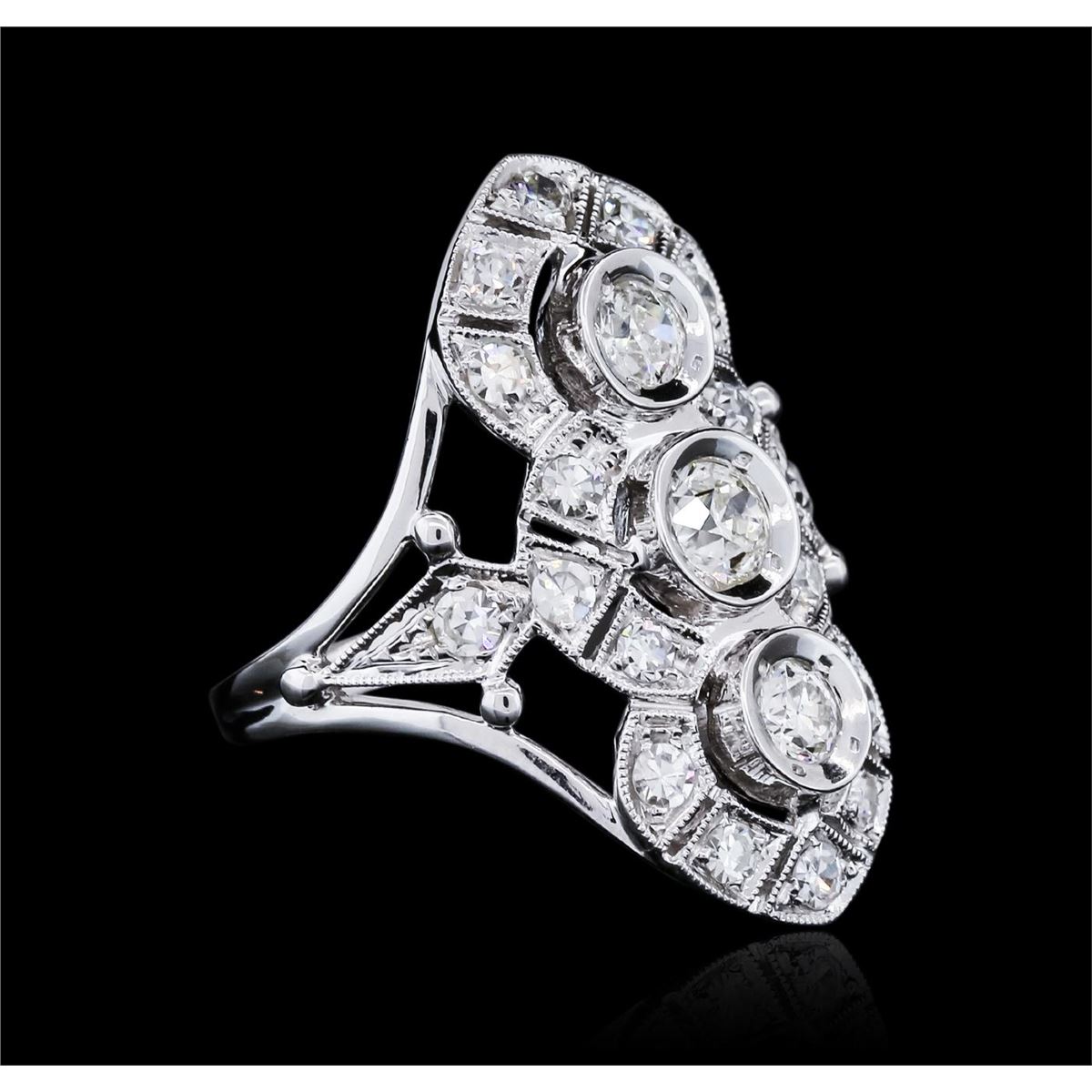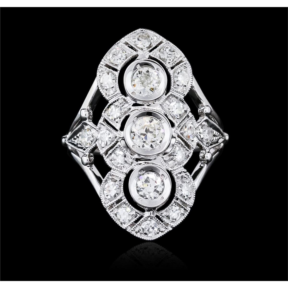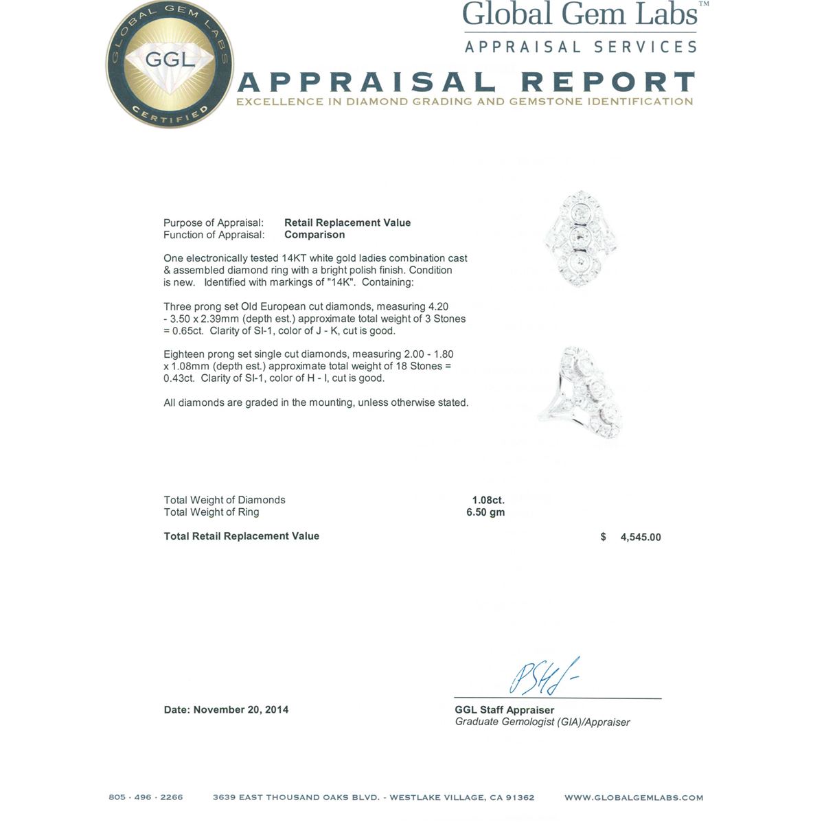 One electronically tested 14KT white gold ladies combination cast & assembled diamond ring with a bright polish finish. Identified with markings of "14K". Condition is new. Containing: Three prong set Old European cut diamonds, measuring 4.20 - 3.50 x 2.39mm (depth est.) approximate total weight of 3 Stones = 0.65ct. Clarity: SI-1. Color: J - K, Cut is Good. Eighteen prong set single cut diamonds, measuring 2.00 - 1.80 x 1.08mm (depth est.) approximate total weight of 18 Stones = 0.43ct. Clarity: SI-1. Color: H - I, Cut is Good. All diamonds are graded in the mounting, unless otherwise stated. Total Weight of Diamonds 1.08ct. Total Weight of Ring 6.50 grams. GGL Appraised at $4,545.00.