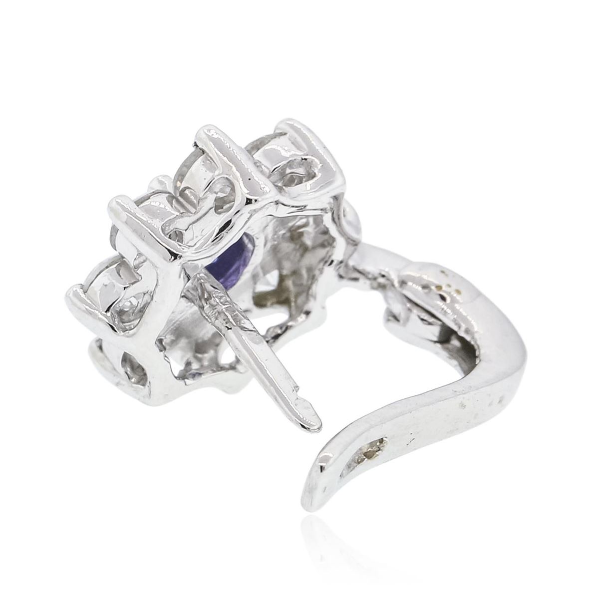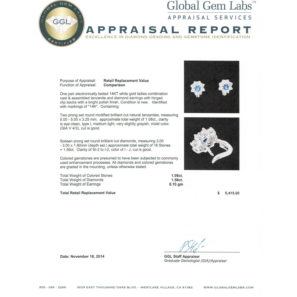 One pair electronically tested 14KT white gold ladies combination cast & assembled tanzanite and diamond earrings with hinged clip backs with a bright polish finish. Identified with markings of "14K". Condition is new. Containing: Two prong set round modified brilliant cut natural tanzanites, measuring 5.00 - 5.00 x 3.25 mm, approximate total weight of 1.08ct., clarity is eye clean, type I, medium light, very slightly grayish, violet color, (GIA V 4/3), cut is good. Sixteen prong set round brilliant cut diamonds, measuring 3.00 - 3.00 x 1.80mm (depth est.) approximate total weight of 16 Stones = 1.58ct. Clarity: SI-2 to I-2. Color: I - J, Cut is Good. Colored gemstones are presumed to have been subjected to commonly used enhancement processes. All diamonds and colored gemstones are graded in the mounting, unless otherwise stated. Total Weight of Colored Stones 1.08ct. Total Weight of Diamonds 1.58ct. Total Weight of Earrings 6.10 grams. GGL Appraised at $5,415.00.