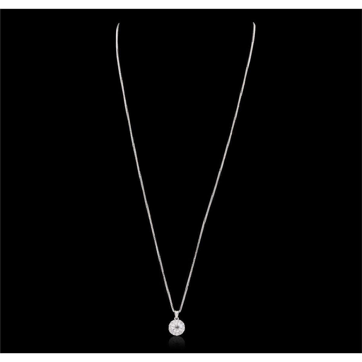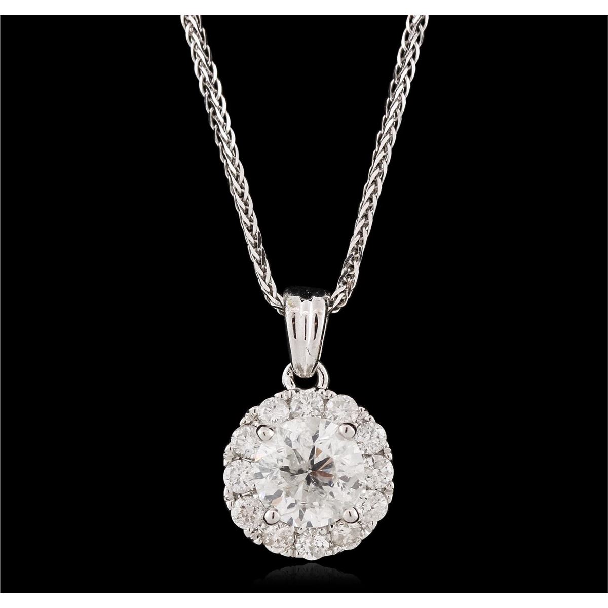 One electronically tested 14KT white gold ladies combination cast & assembled diamond pendant & chain 18.0" long, medium fancy cable with a lobster claw clasp with a bright polish finish. Identified with markings of "14K". Condition is new. Containing: One prong set round brilliant cut diamond, measuring 5.90 - 5.88 x 3.90mm (depth est.) approximate weight of 0.83ct. Clarity: I-2. Color: J, Cut is Good. Twelve prong set round brilliant cut diamonds, measuring 1.80 - 1.80 x 1.08mm (depth est.) approximate total weight of 12 Stones = 0.26ct. Clarity: SI-2 to I-2. Color: H - J, Cut is Good. All diamonds are graded in the mounting, unless otherwise stated. Total Weight of Diamonds 1.08ct. Total Weight of Pendant & Chain 2.70 grams. GGL Appraised at $4,955.00.
