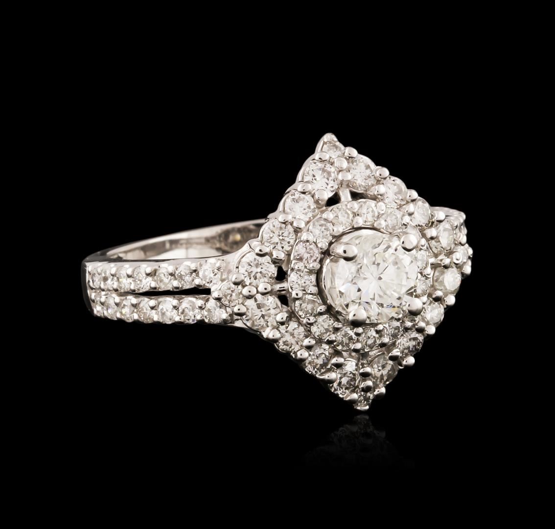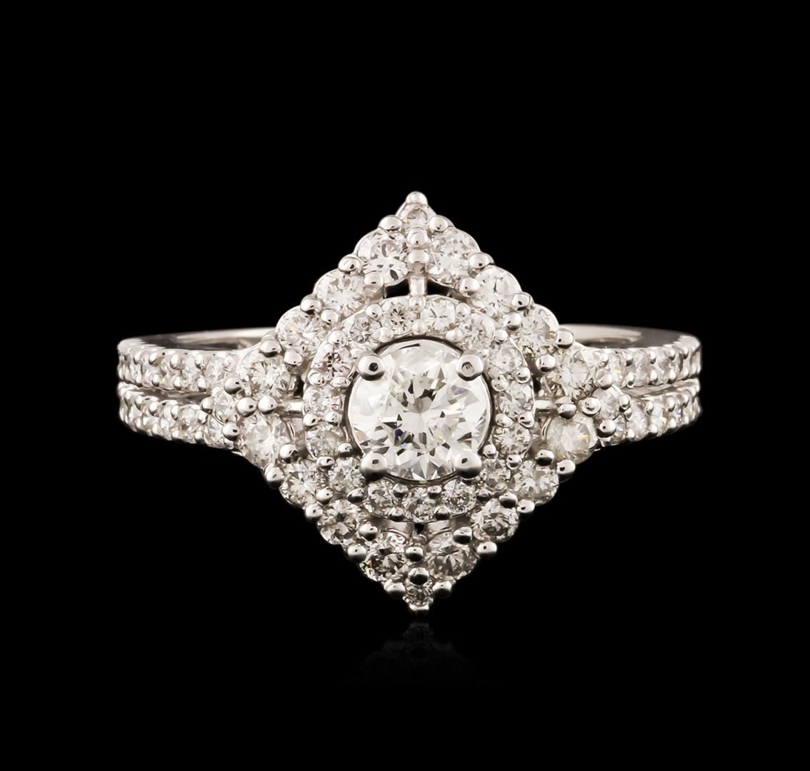 One electronically tested 14KT white gold ladies cast diamond engagement ring with a bright polish finish. Identified with markings of "14K". Condition is new. Containing: One prong set round brilliant cut diamond, measuring 4.76 - 4.65 x 2.83mm (depth est.) approximate weight of 0.38ct. Clarity: I-1. Color: I, Cut is Good. Sixty-Three prong set round brilliant cut diamonds, measuring 2.00 - 1.30 x 0.99mm (depth est.) approximate total weight of 63 Stones = 0.70ct. Clarity: SI-1 to I-1. Color: H - I, Cut is Good. All diamonds are graded in the mounting, unless otherwise stated. Total Weight of Diamonds 1.08ct. Total Weight of Engagement Ring 4.00 grams. GGL Appraised at $4,095.00.