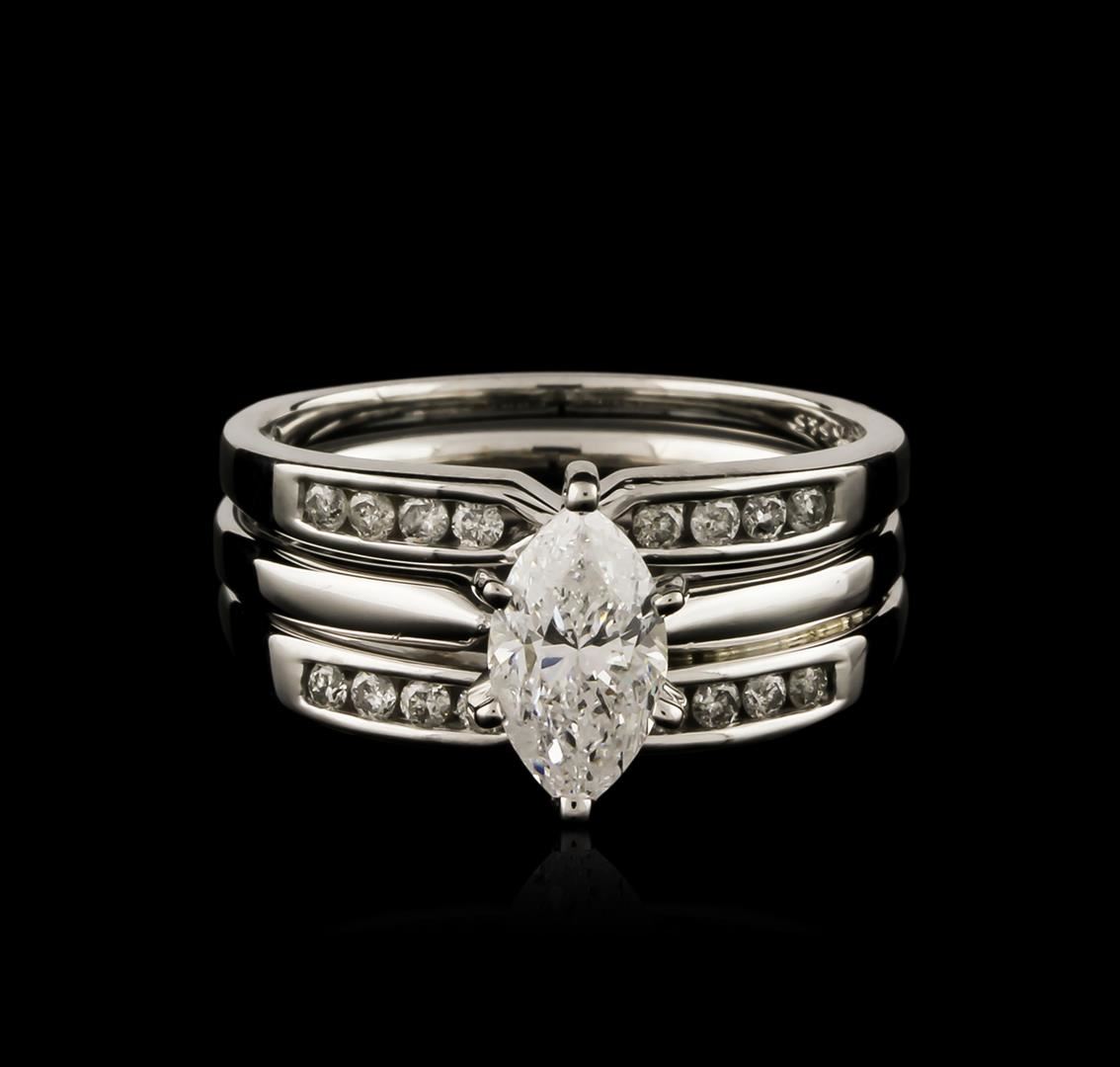 One electronically tested 14KT white gold ladies cast diamond engagement ring with a bright polish finish. Identified with markings of "14K". Condition is new. Containing: One prong set marquise shaped cut diamond, measuring 9.00 x 5.20 x 3.28mm (depth est.) approximate weight of 0.89ct. Clarity: I-1. Color: G, Cut is Good. Sixteen channel set round brilliant cut diamonds, measuring 1.50 - 1.50 x 0.90mm (depth est.) approximate total weight of 16 Stones = 0.20ct. Clarity: I-2. Color: H - I, Cut is Good. All diamonds are graded in the mounting, unless otherwise stated. Total Weight of Diamonds 1.09ct. Total Weight of Engagement Ring 6.50 grams. GGL Appraised at $4,745.00.