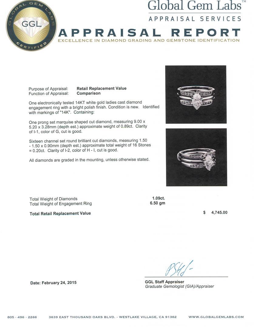 One electronically tested 14KT white gold ladies cast diamond engagement ring with a bright polish finish. Identified with markings of "14K". Condition is new. Containing: One prong set marquise shaped cut diamond, measuring 9.00 x 5.20 x 3.28mm (depth est.) approximate weight of 0.89ct. Clarity: I-1. Color: G, Cut is Good. Sixteen channel set round brilliant cut diamonds, measuring 1.50 - 1.50 x 0.90mm (depth est.) approximate total weight of 16 Stones = 0.20ct. Clarity: I-2. Color: H - I, Cut is Good. All diamonds are graded in the mounting, unless otherwise stated. Total Weight of Diamonds 1.09ct. Total Weight of Engagement Ring 6.50 grams. GGL Appraised at $4,745.00.