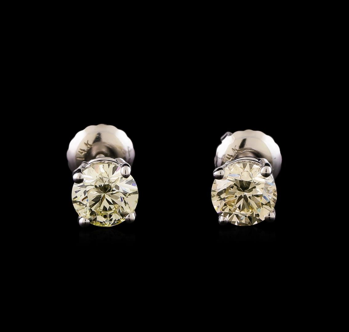 One pair electronically tested 14KT white gold cast & assembled diamond solitaire earrings with screw backs. Condition is new, good workmanship. Containing: One prong set round brilliant cut diamond, measuring 5.18 - 5.15 x 3.25mm (depth est.), 4.00% GTCF approximate weight of 0.55ct with a very strong blue fluorescence. Graded in the setting. Clarity: I-1. Depth: 62.9%. Table 58.0%. One prong set round brilliant cut diamond, measuring 5.20 - 5.17 x 3.28mm (depth est.) approximate weight of 0.54ct with a strong blue fluorescence. Graded in the setting. Clarity: I-1. Depth: 63.2%. Table 51.6%. Total Weight of Diamonds 1.09ct. Total Weight of Earrings 1.00 grams. AIG Appraised at $3,280.00.