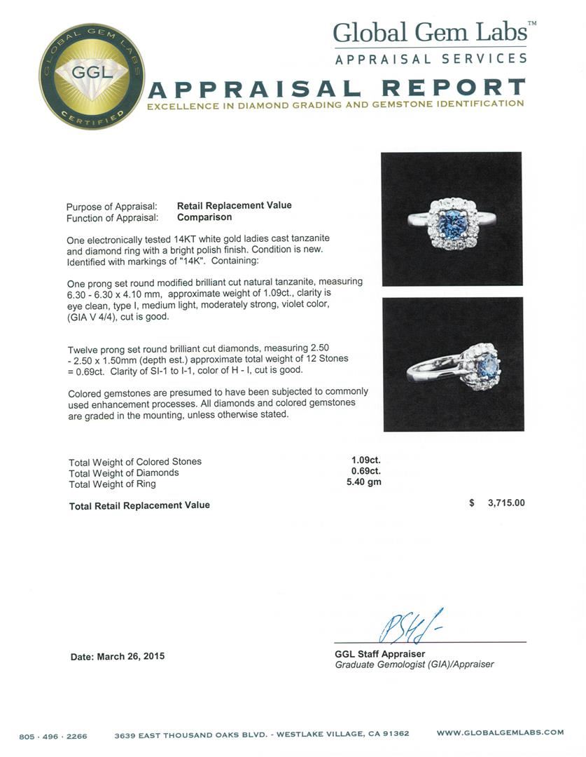 One electronically tested 14KT white gold ladies cast tanzanite and diamond ring with a bright polish finish. Identified with markings of "14K". Condition is new. Containing: One prong set round modified brilliant cut natural tanzanite, measuring 6.30 - 6.30 x 4.10 mm, approximate weight of 1.09ct., clarity is eye clean, type I, medium light, moderately strong, violet color, (GIA V 4/4), cut is good. Twelve prong set round brilliant cut diamonds, measuring 2.50 - 2.50 x 1.50mm (depth est.) approximate total weight of 12 Stones = 0.69ct. Clarity: SI-1 to I-1. Color: H - I, Cut is Good. Colored gemstones are presumed to have been subjected to commonly used enhancement processes. All diamonds and colored gemstones are graded in the mounting, unless otherwise stated. Total Weight of Colored Stones 1.09ct. Total Weight of Diamonds 0.69ct. Total Weight of Ring 5.40 grams. GGL Appraised at $3,715.00.