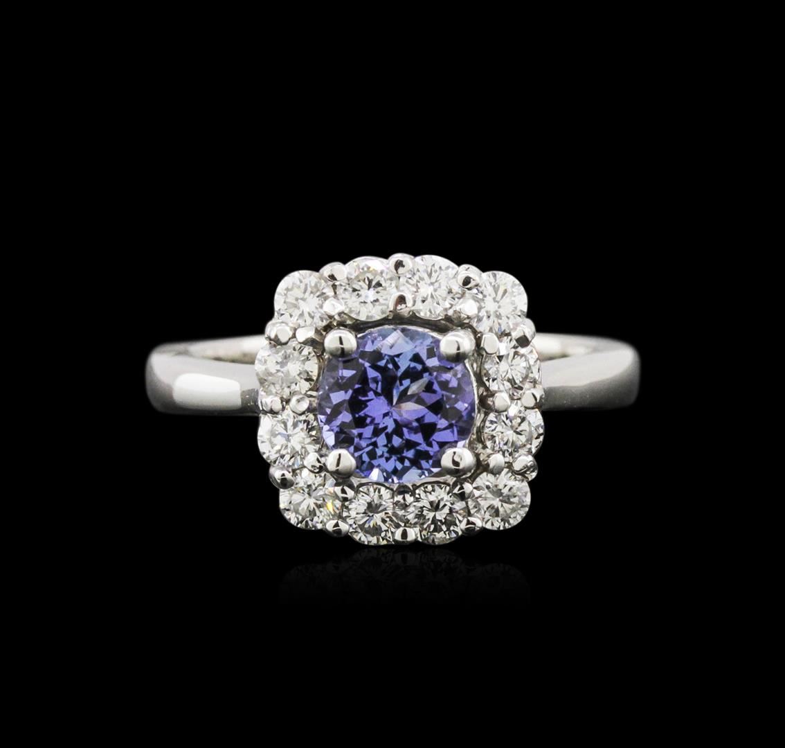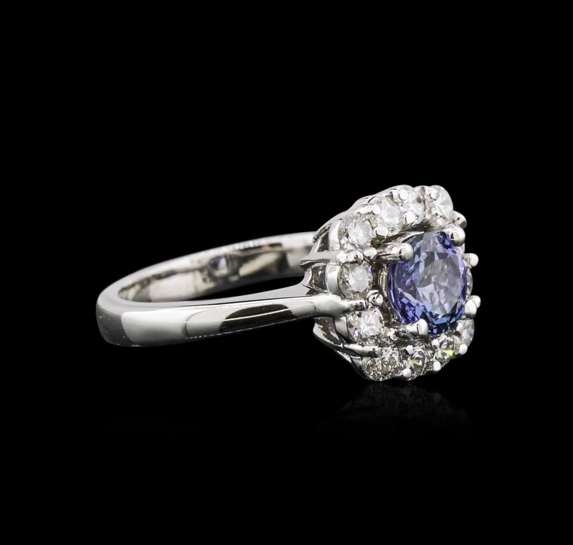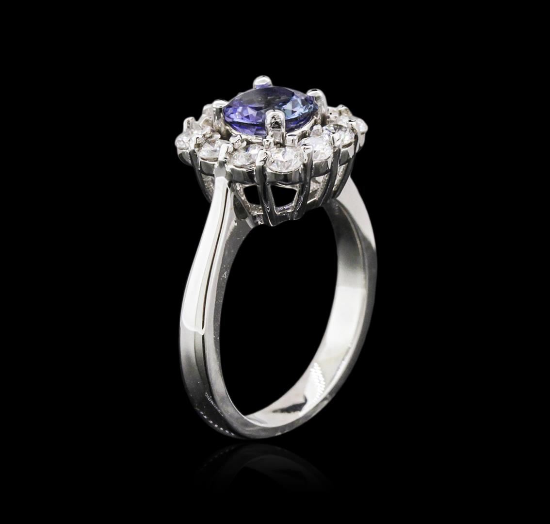 One electronically tested 14KT white gold ladies cast tanzanite and diamond ring with a bright polish finish. Identified with markings of "14K". Condition is new. Containing: One prong set round modified brilliant cut natural tanzanite, measuring 6.30 - 6.30 x 4.10 mm, approximate weight of 1.09ct., clarity is eye clean, type I, medium light, moderately strong, violet color, (GIA V 4/4), cut is good. Twelve prong set round brilliant cut diamonds, measuring 2.50 - 2.50 x 1.50mm (depth est.) approximate total weight of 12 Stones = 0.69ct. Clarity: SI-1 to I-1. Color: H - I, Cut is Good. Colored gemstones are presumed to have been subjected to commonly used enhancement processes. All diamonds and colored gemstones are graded in the mounting, unless otherwise stated. Total Weight of Colored Stones 1.09ct. Total Weight of Diamonds 0.69ct. Total Weight of Ring 5.40 grams. GGL Appraised at $3,715.00.